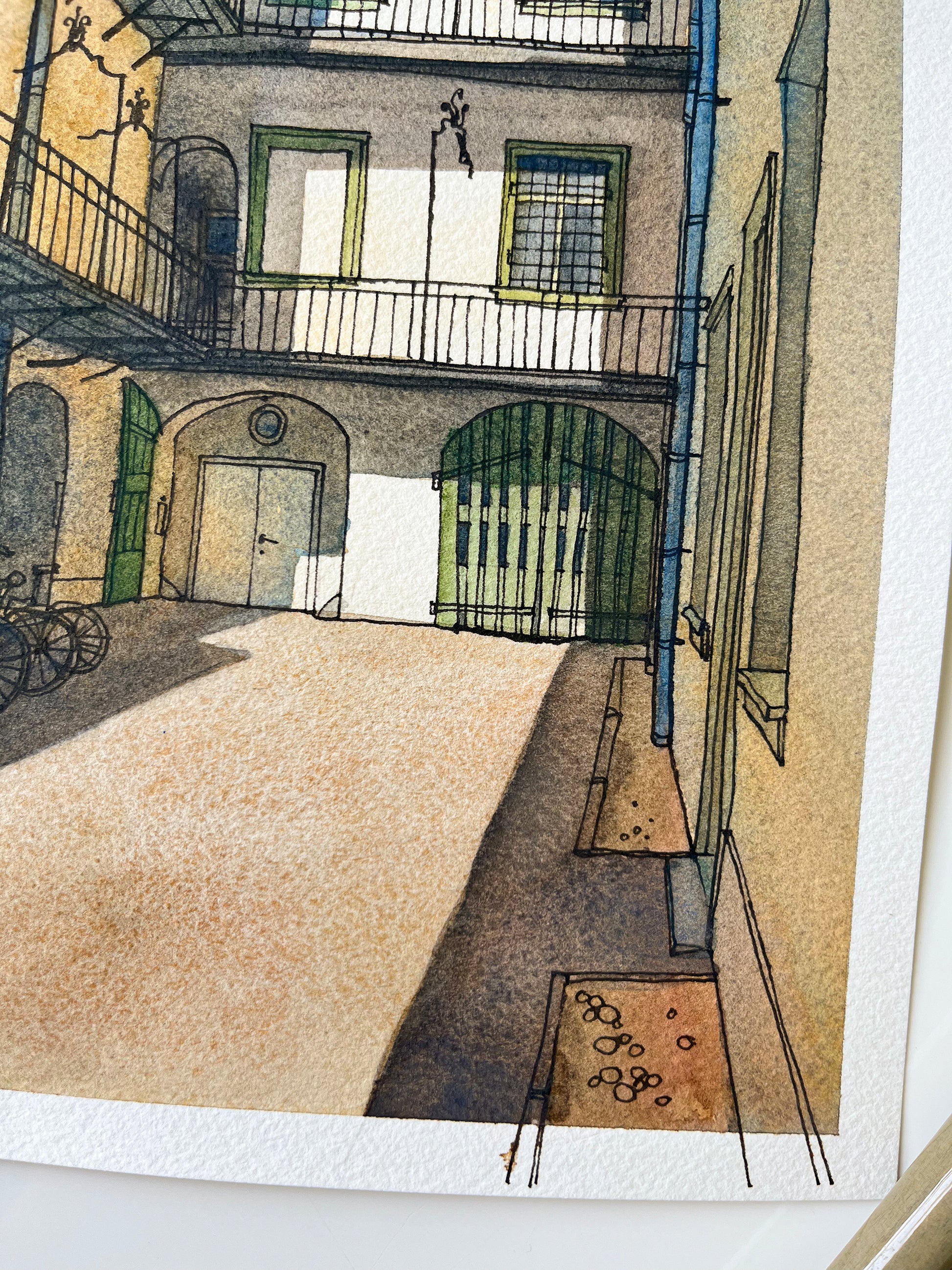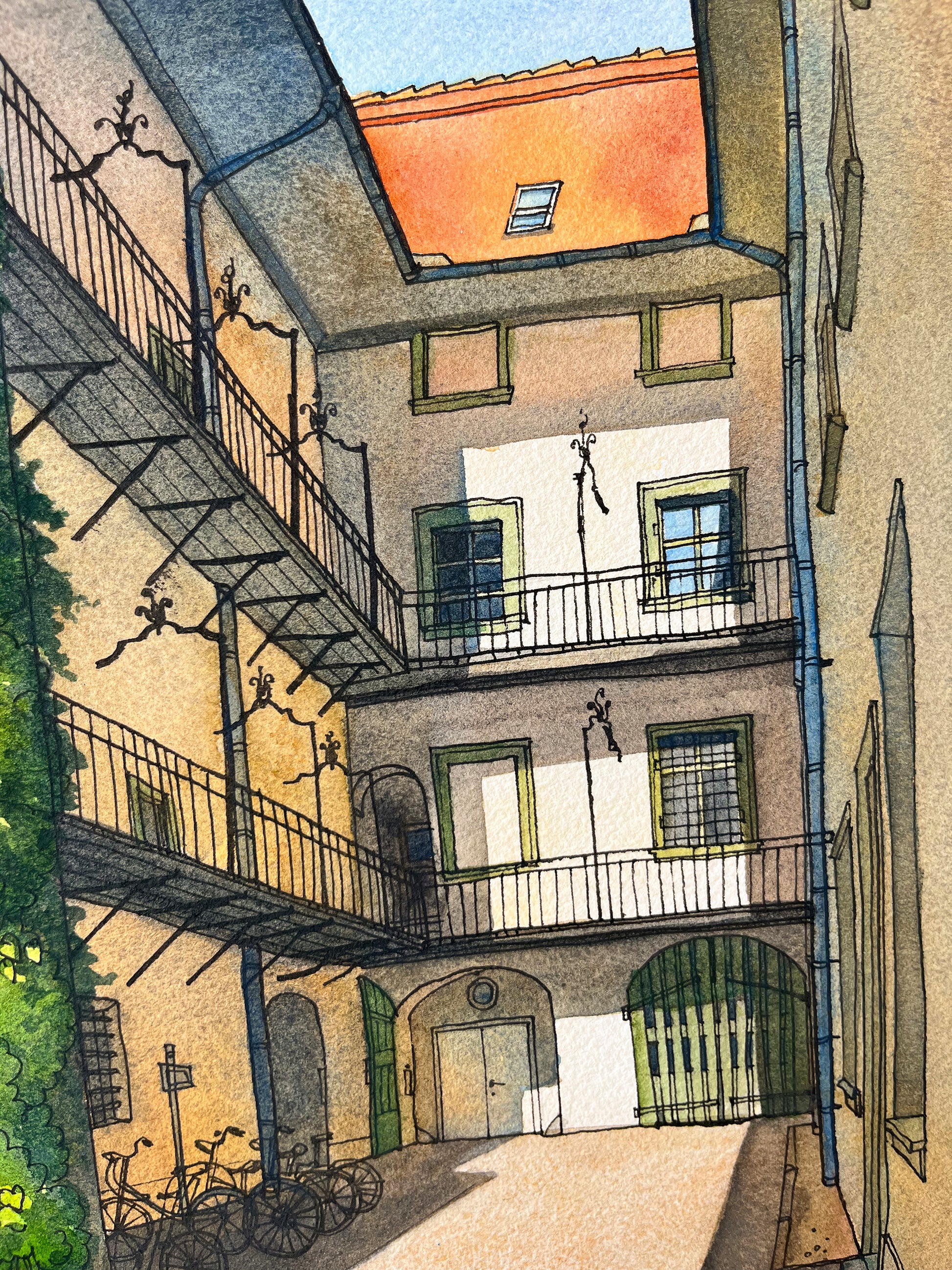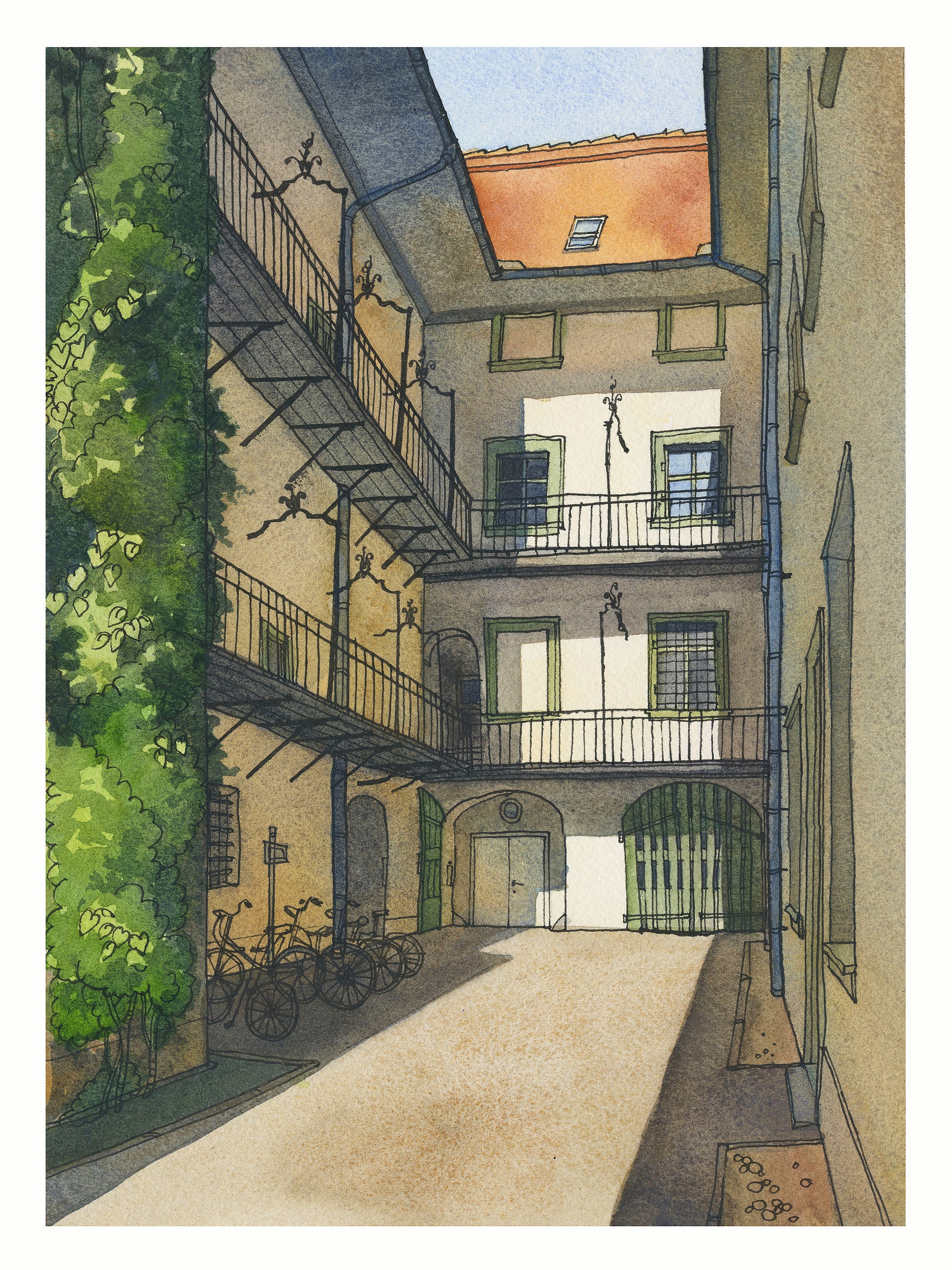 Grazer Innenhof in der Sackstraße 16 — Architektur Aquarell Giclée Druck (#A20)