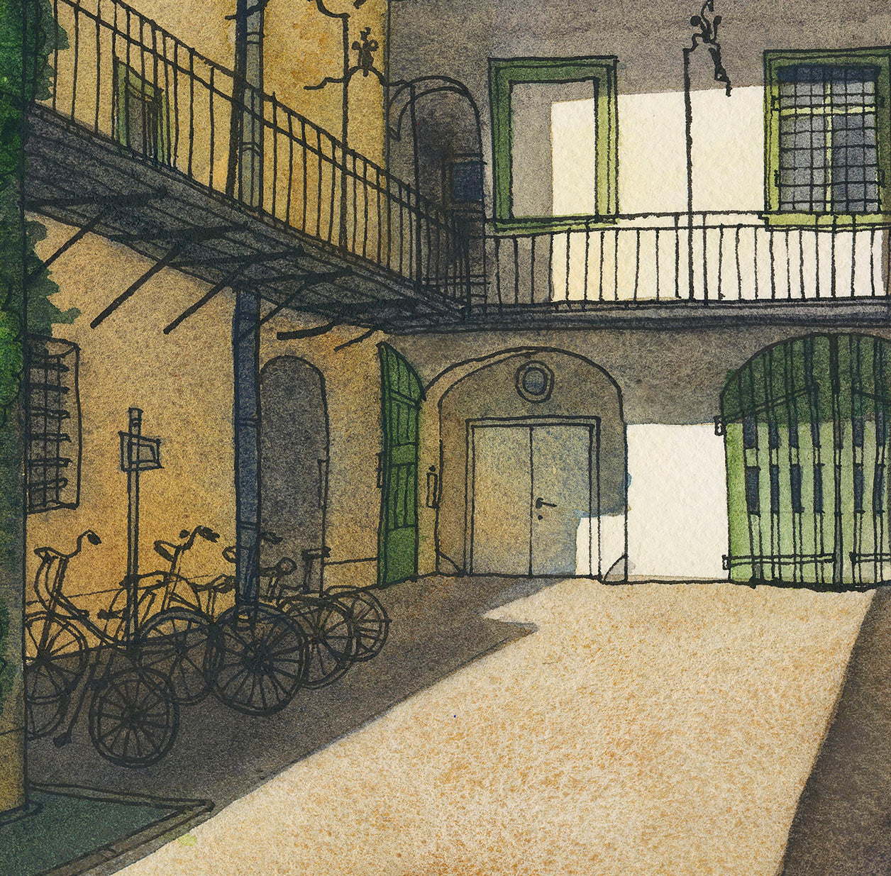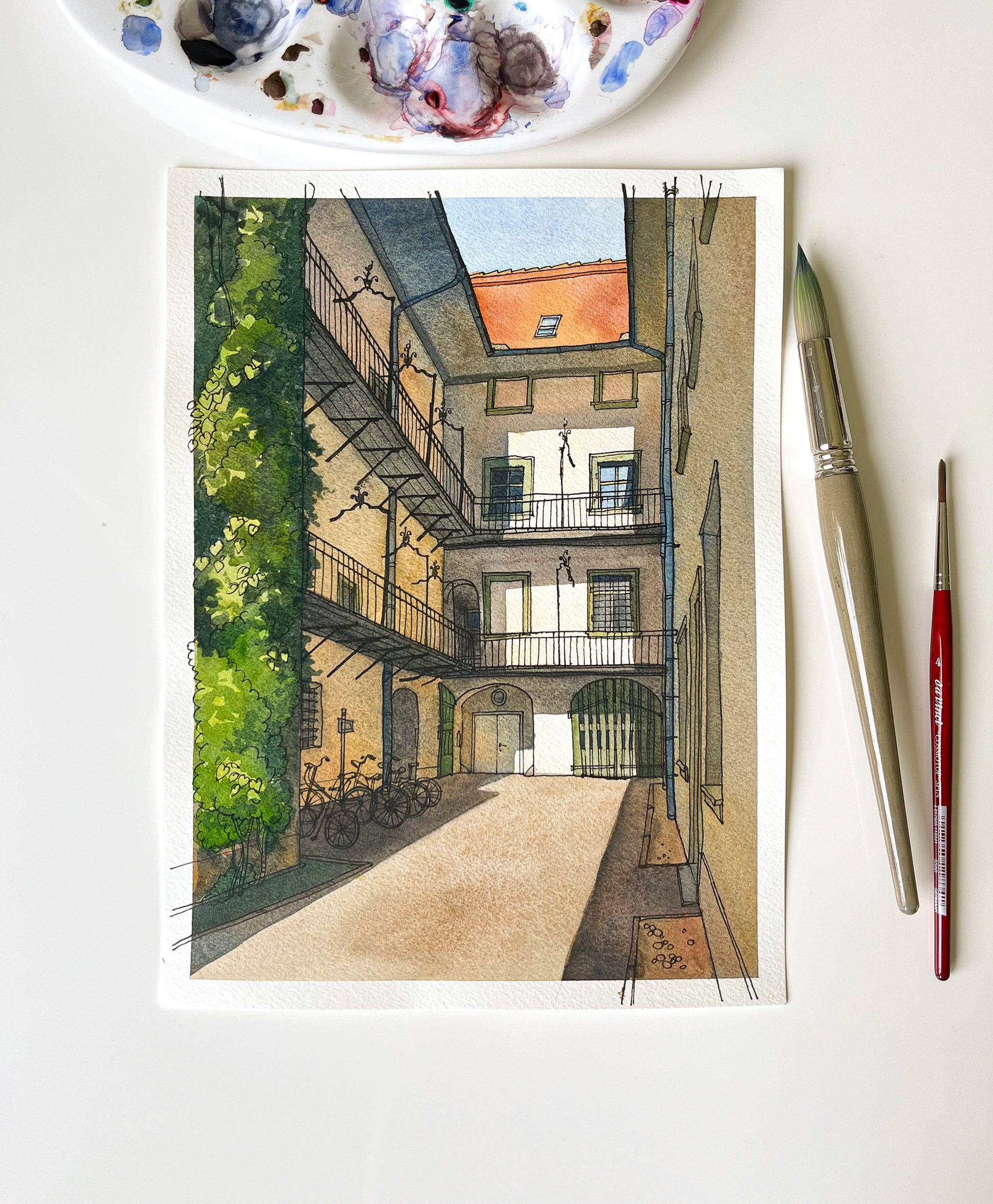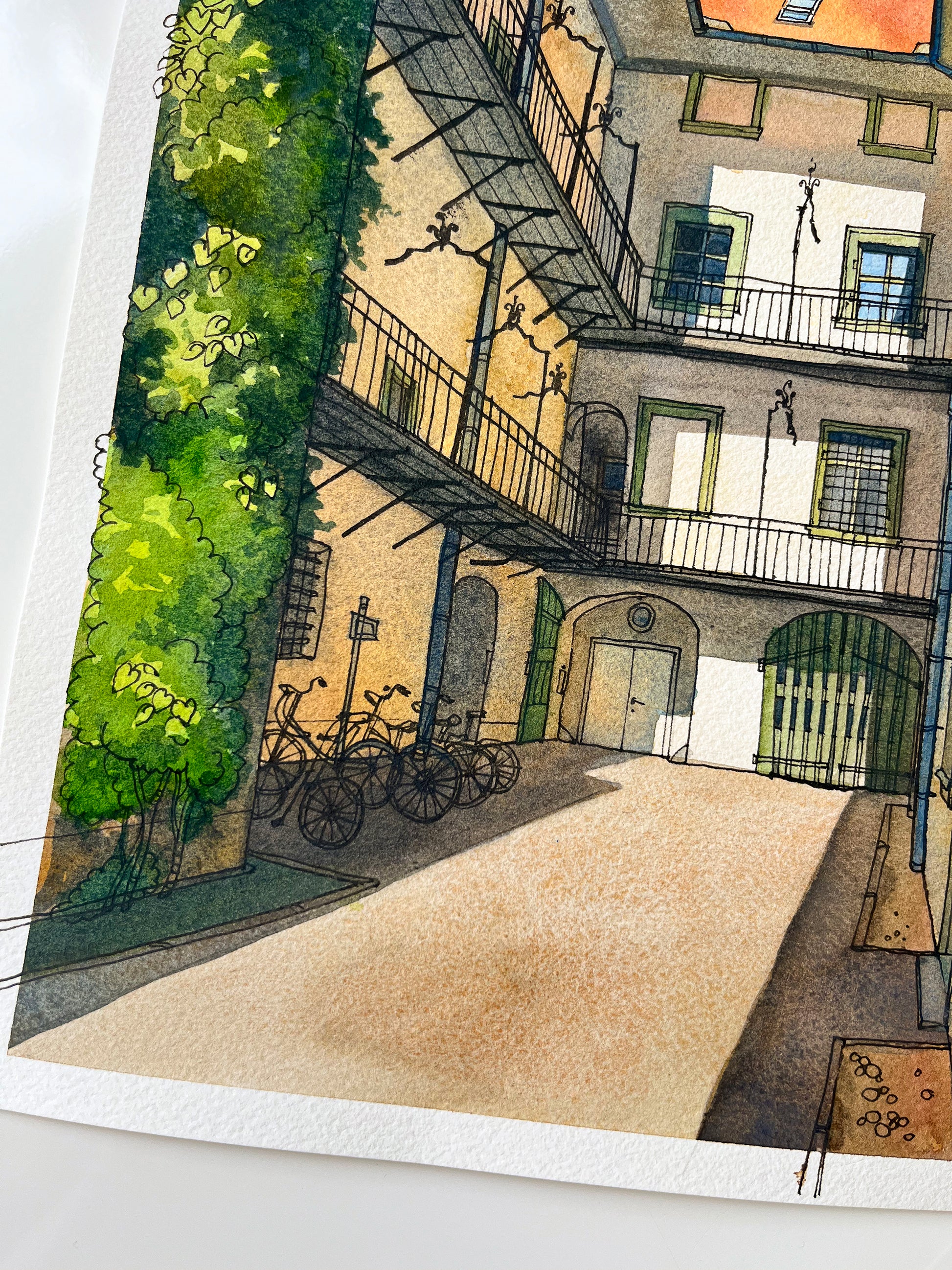 Grazer Innenhof in der Sackstraße 16 — Architektur Aquarell Giclée Druck (#A20)