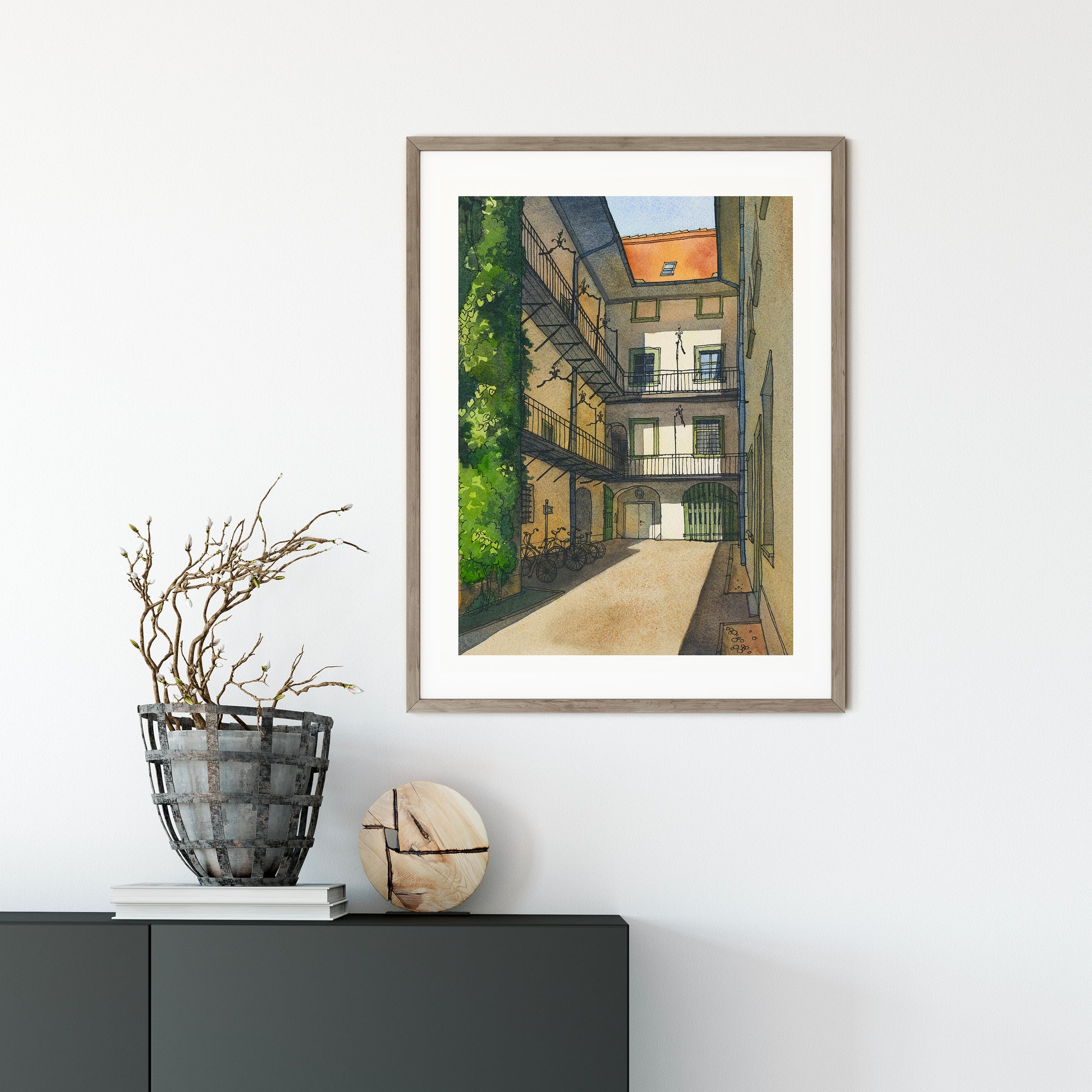 Ein Kunstdruck des Innenhofs in der Sackstraße 16 in Graz, Österreich. Ursprünglich in Tusche- und Aquarelltechnik erstellt und später als Giclée-Druck in Museumsqualität veröffentlicht. Das Originalgemälde ist 9" × 12" – 230 × 305 mm – groß.