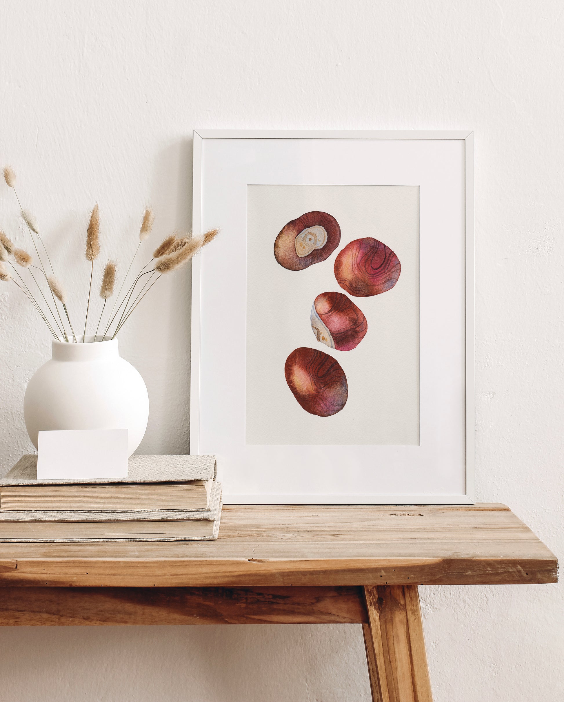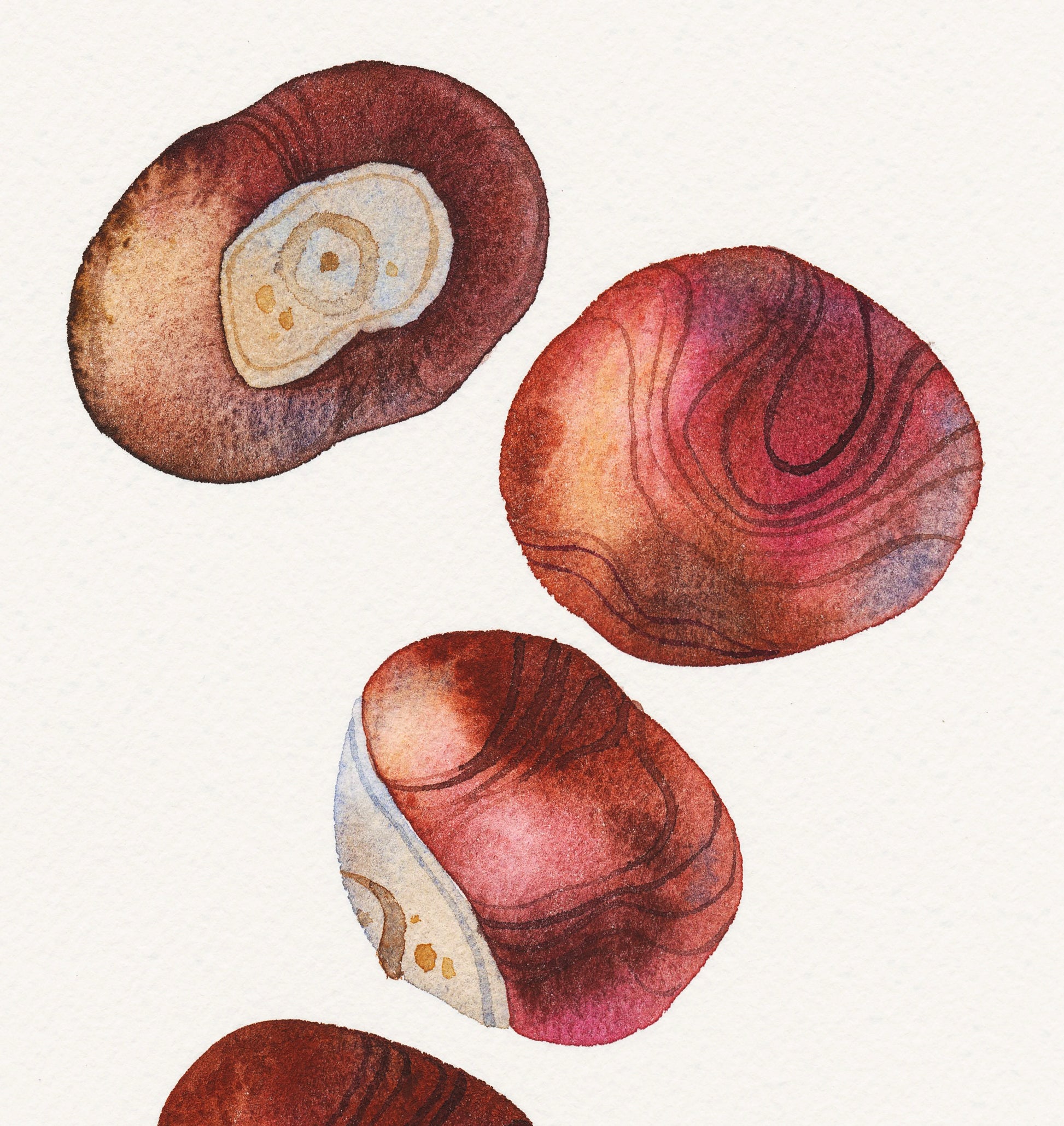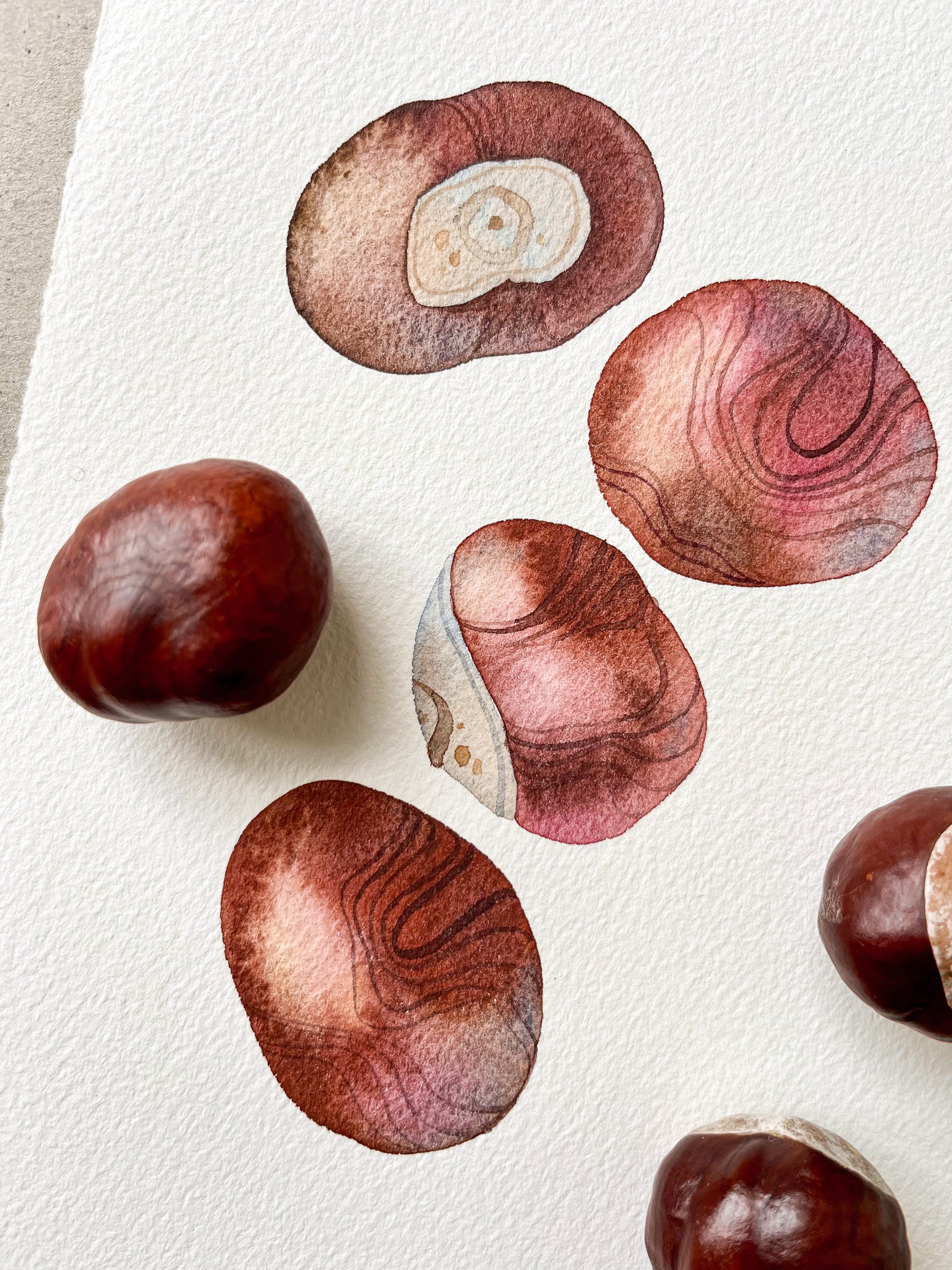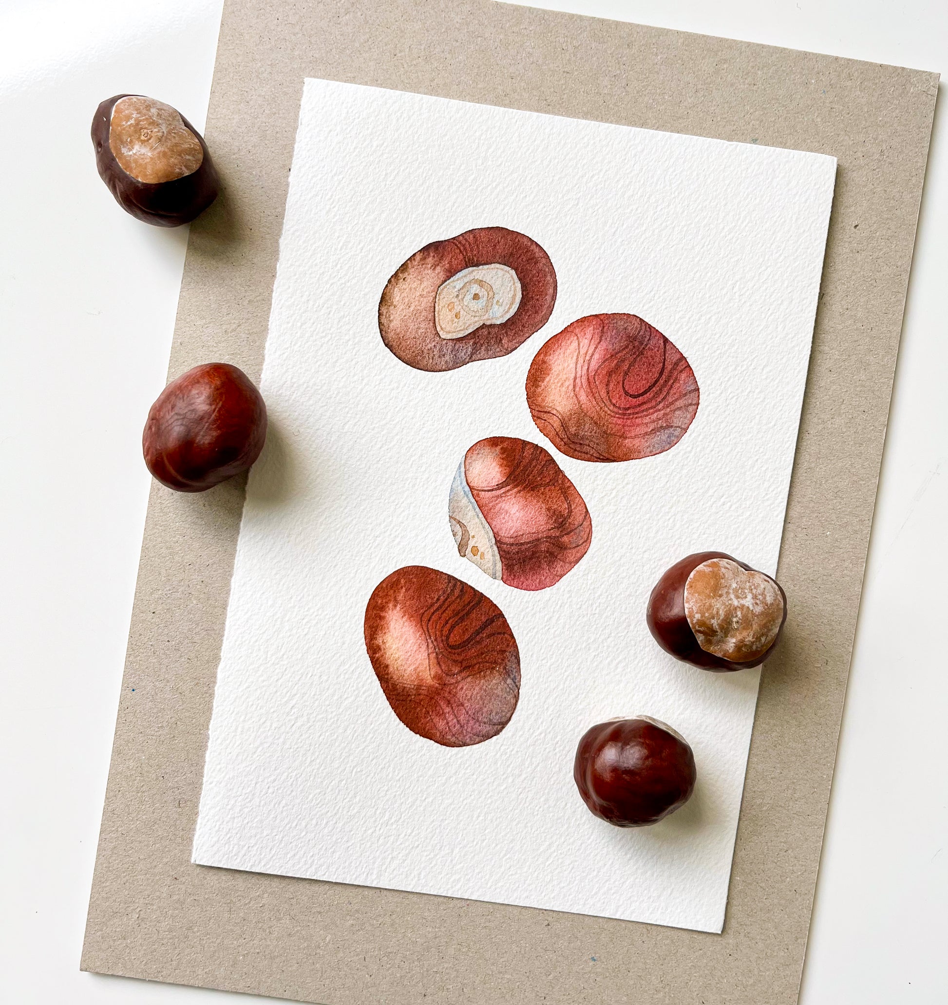 Kunstdruck von Rosskastanien , ursprünglich nach der Natur in Aquarelltechnik erstellt und später als Giclée-Druck in Museumsqualität gedruckt. Die Originalgröße des Gemäldes beträgt 155 × 230 mm.