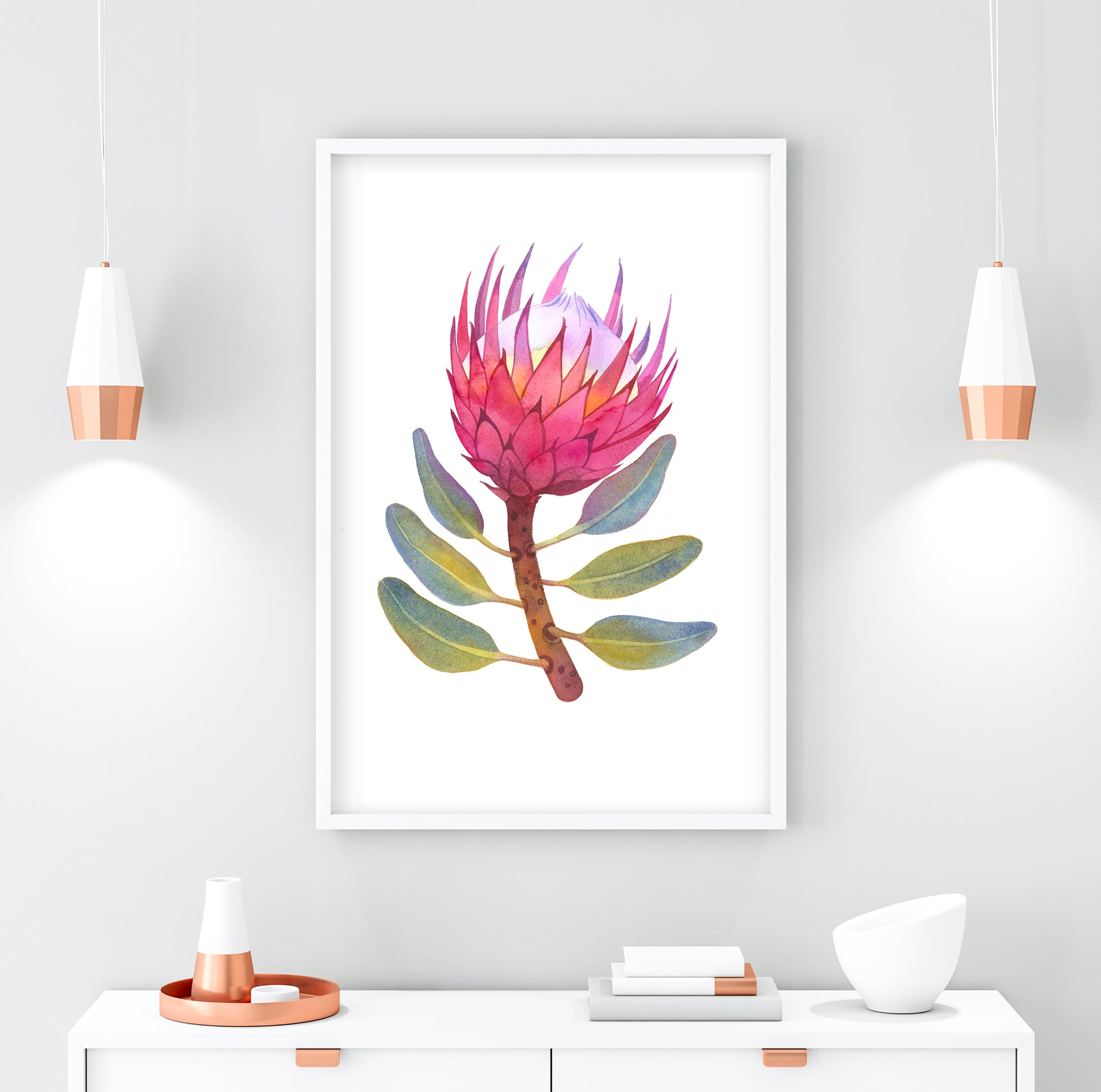 PINK KING PROTEA Aquarell Malerei Giclée-Druck #W32