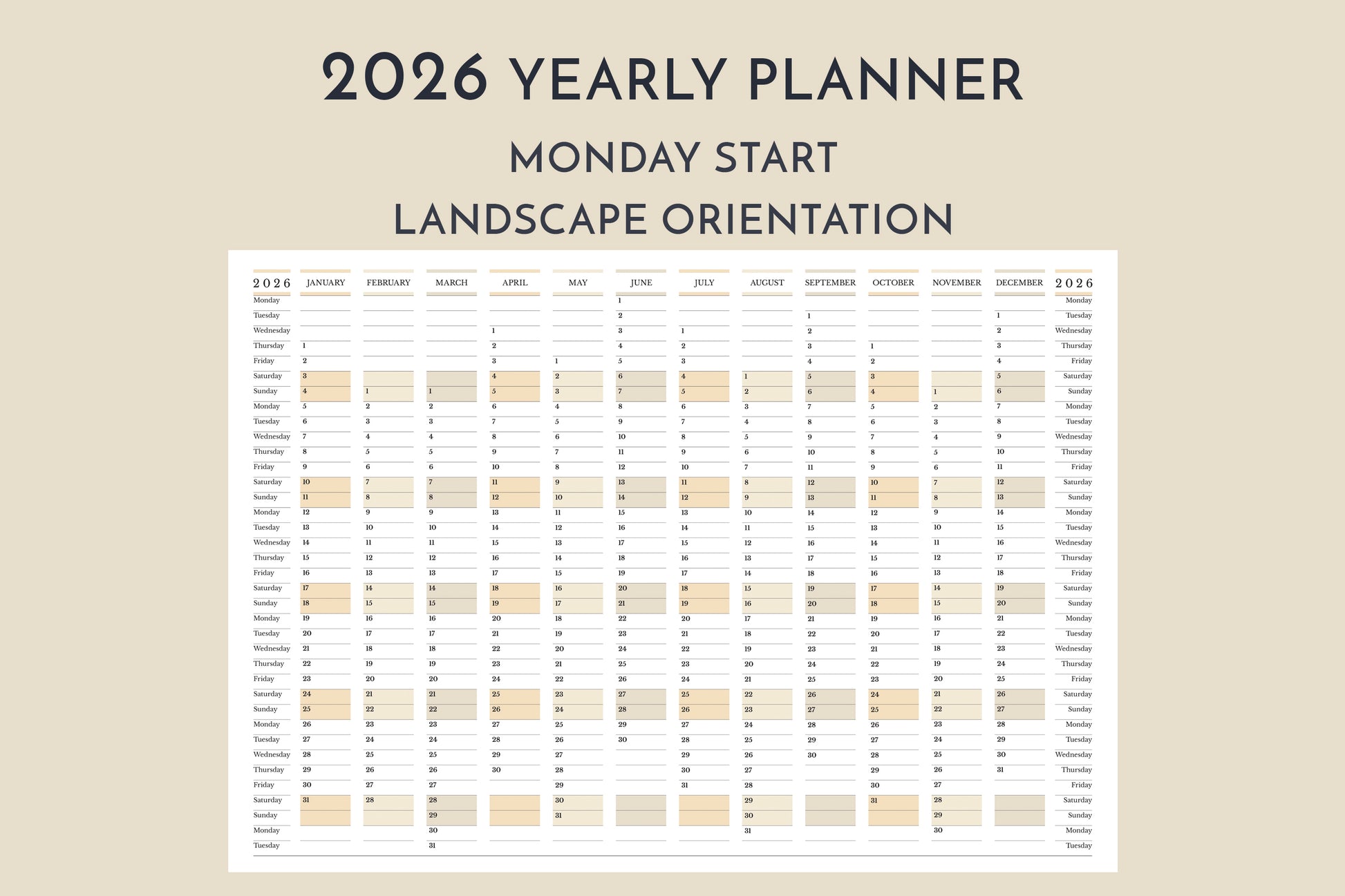 2026 Yearly Wall Planner in landscape orientation, Monday start. All text and elements are fully editable.