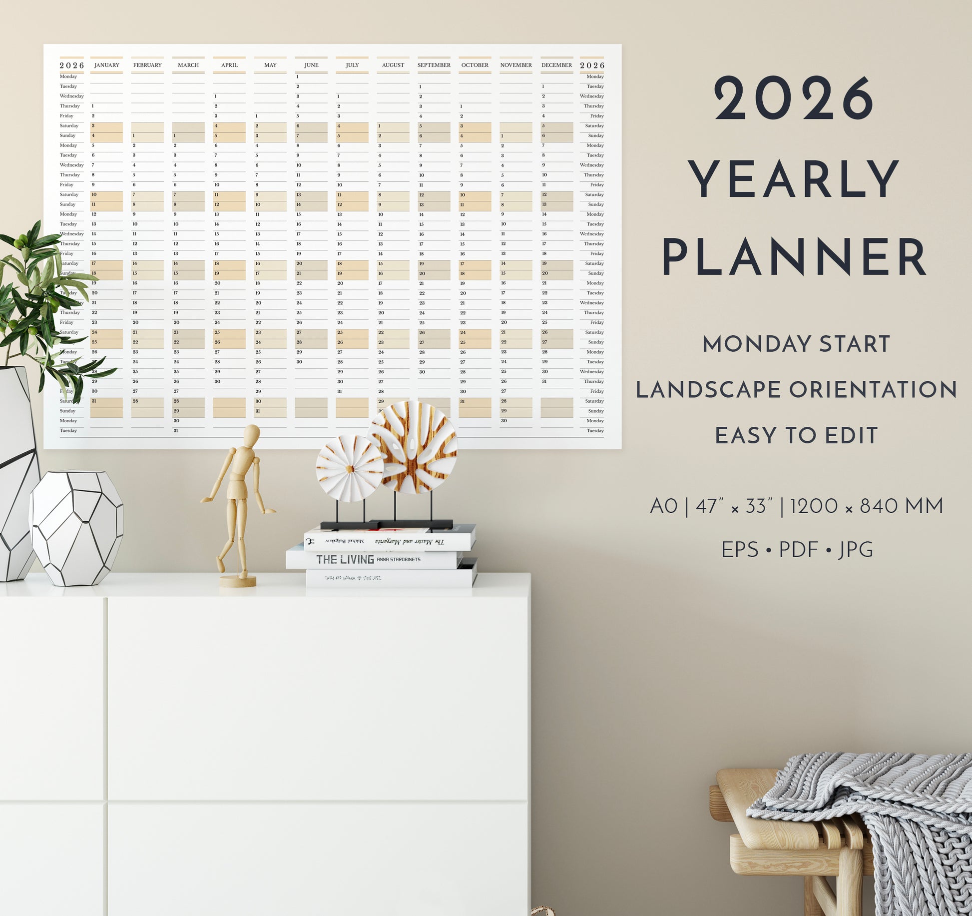 2026 Minimal Yearly Wall Planner Monday Start in Landscape Orientation • Extra Large A0 Wall Calendar