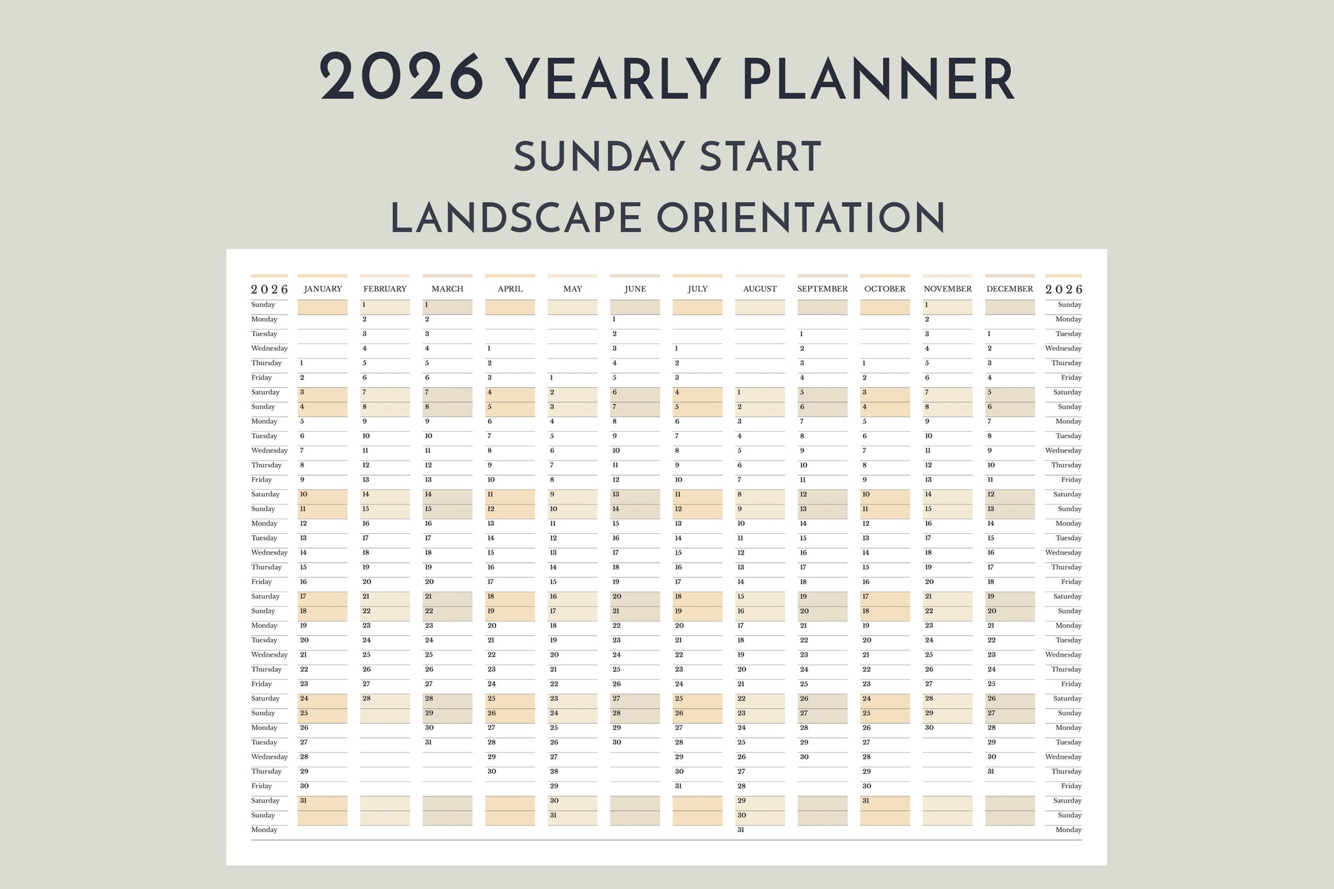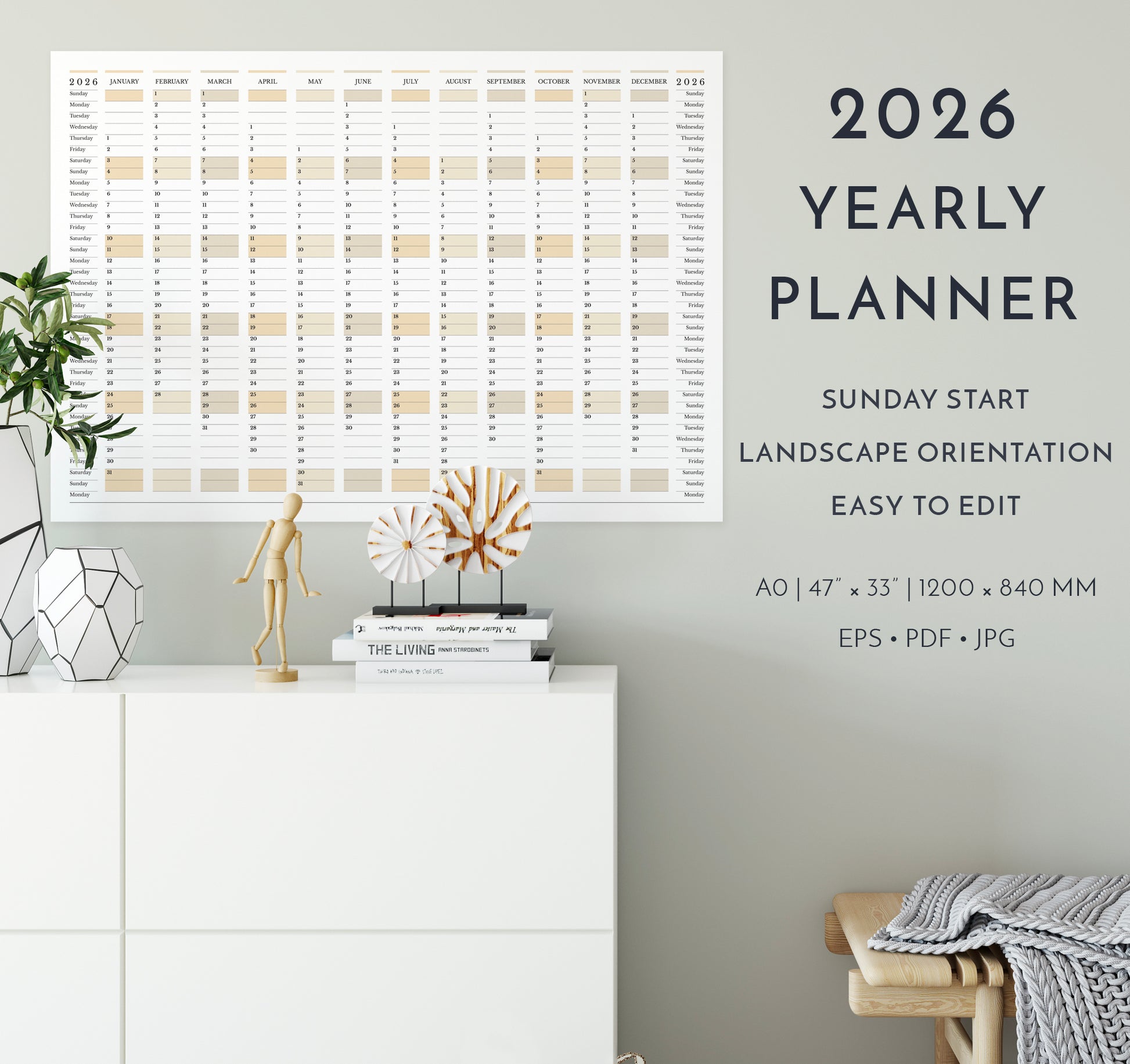 2026 Minimal Yearly Wall Planner Sunday Start in Landscape Orientation • Extra Large A0 Wall Calendar