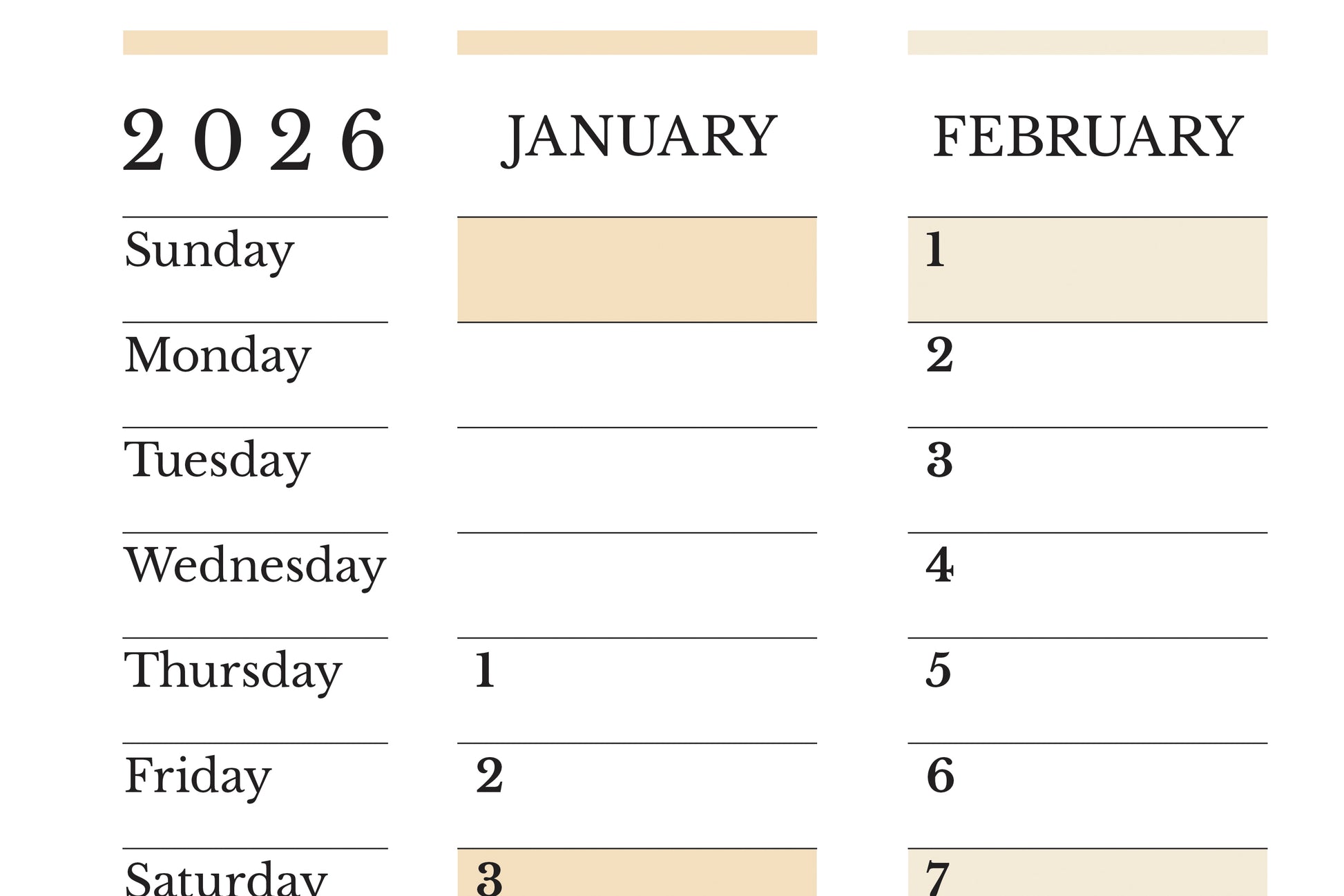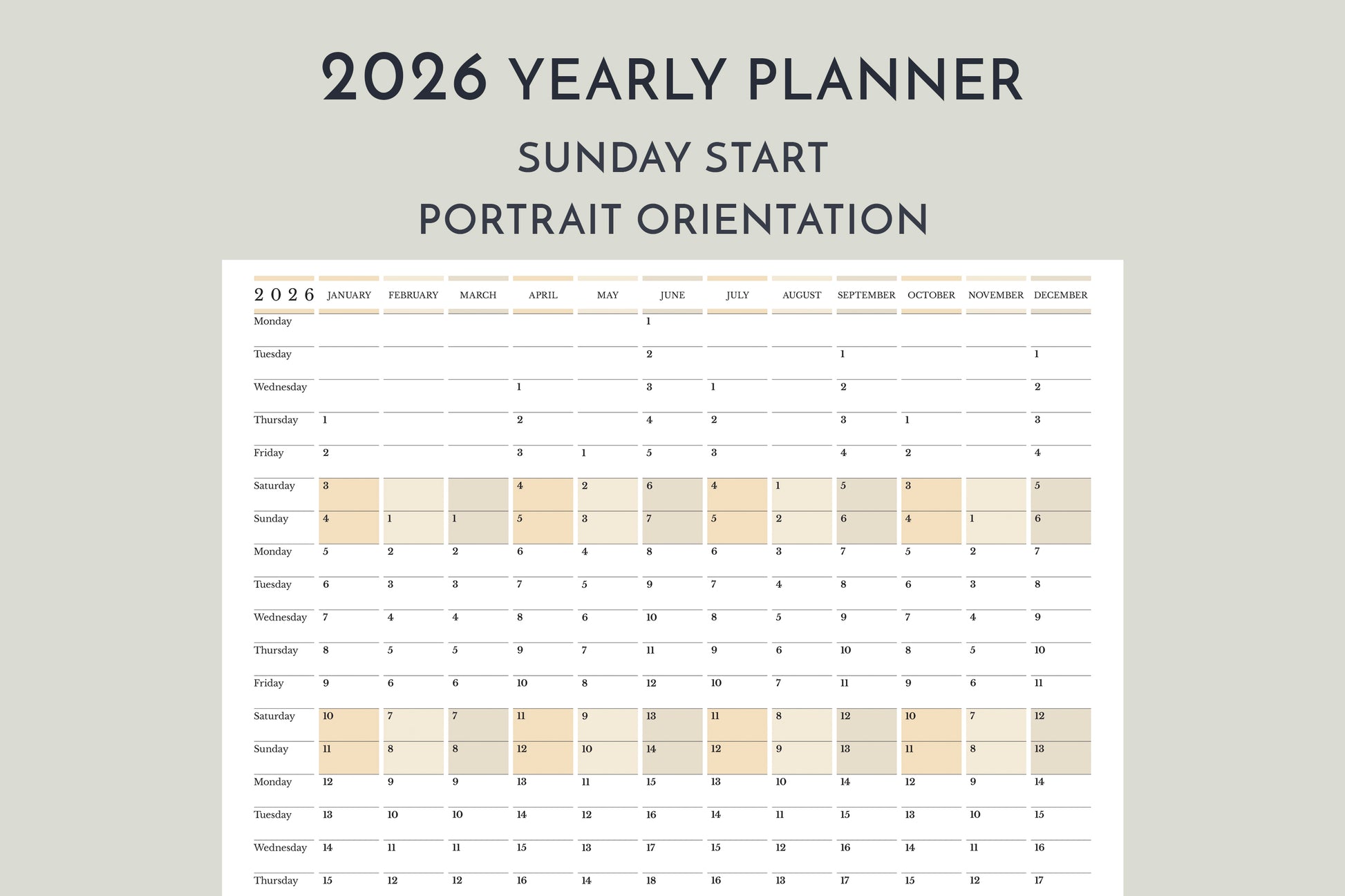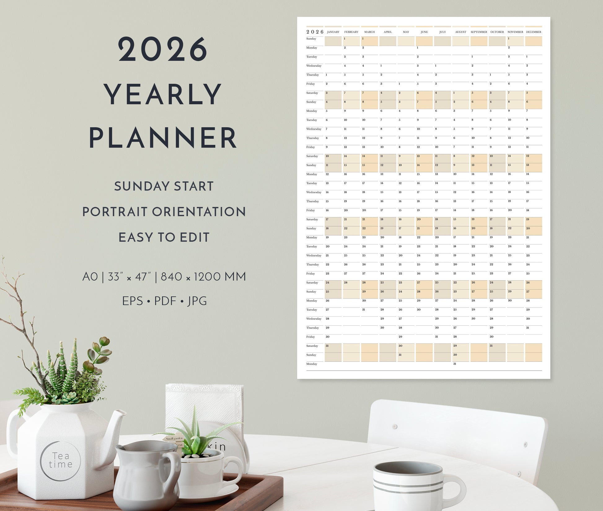 2026 Minimal Yearly Wall Planner Sunday Start in Portrait Orientation • Extra Large A0 Wall Calendar