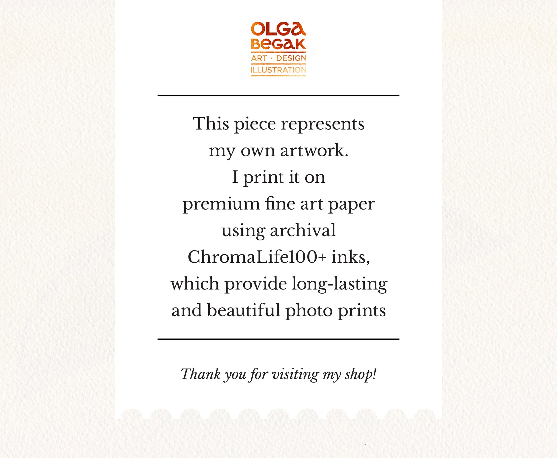 The artworks are printed with Canon technology which ensures reduction of granularity, smooth color gradation and high print resolution. Prints made using this technology can last for more than 200 years in a photo album, for about 40 years on display behind glass, and for about 10 years without glass.