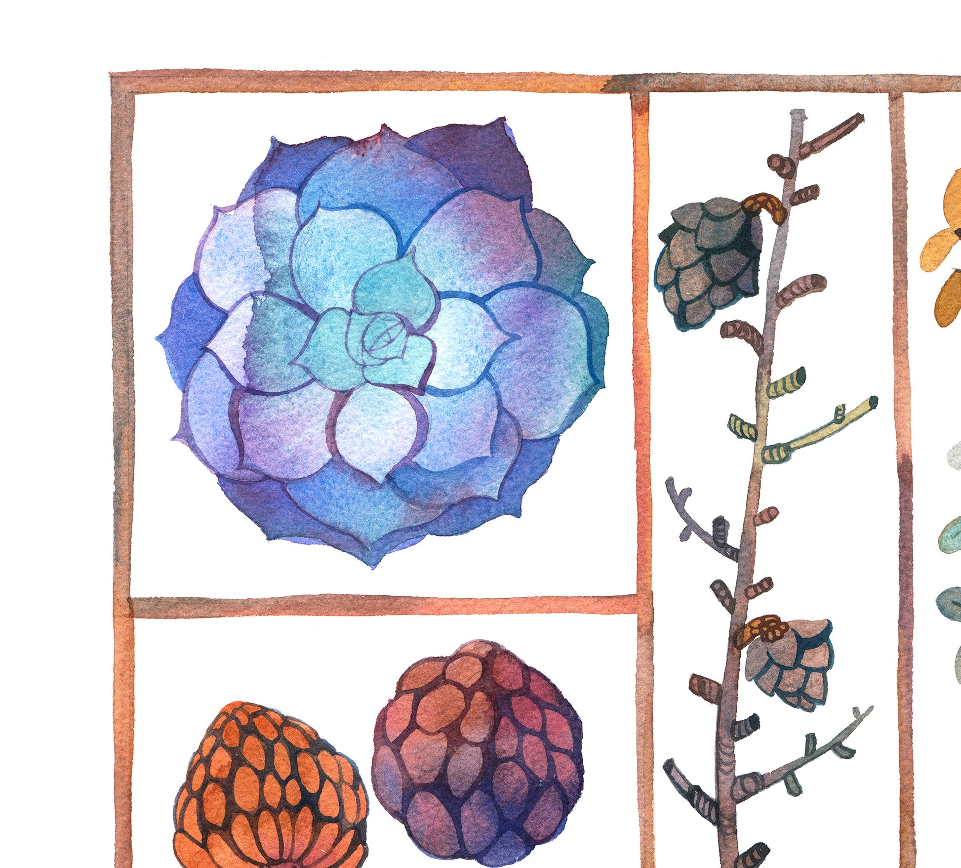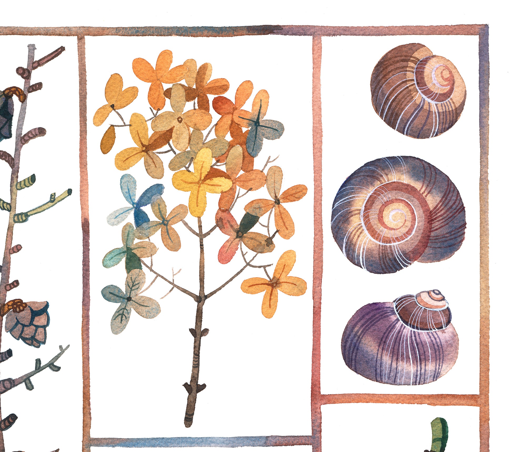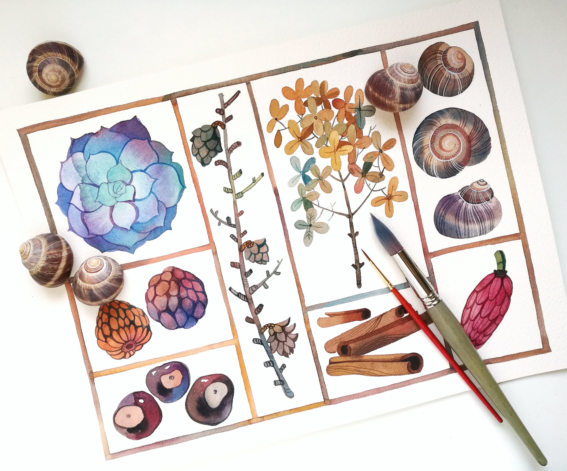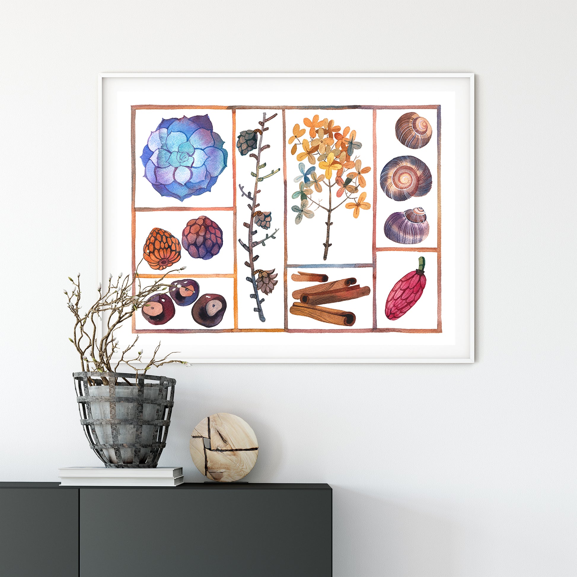 Fine art print NATURE GIFTS COLLECTION #03 from my NATURE GIFTS series. The artwork represents Succulent, Magnolia fruits, Chestnuts, Larch branch, Hydrangea, Cinnamon, Shells, Magnolia fruit. Originally made from life in watercolor technique finished with ink and later turned into giclée—fine art prints of museum quality.