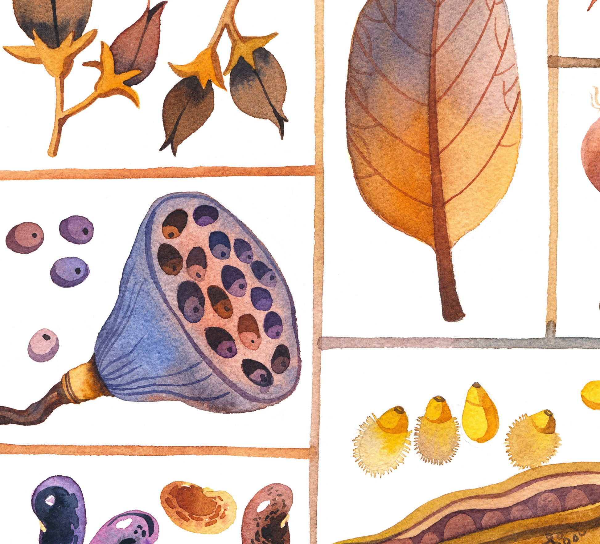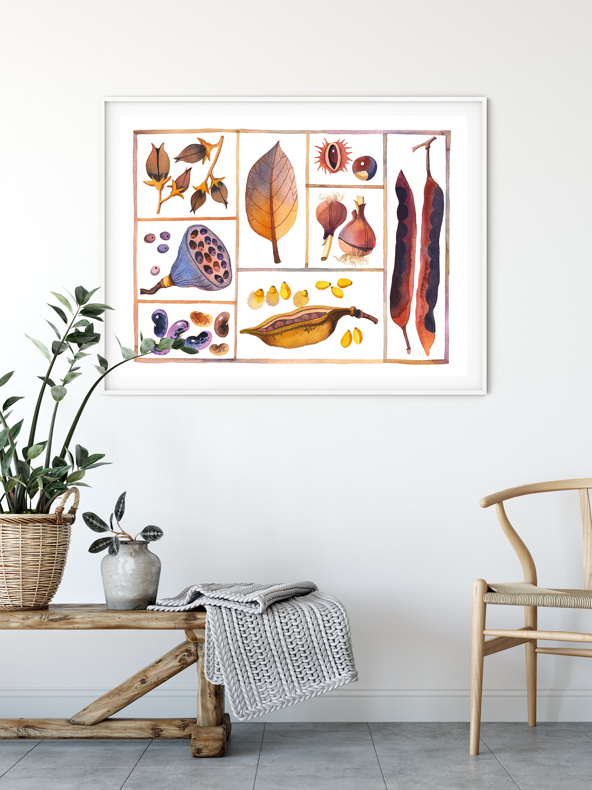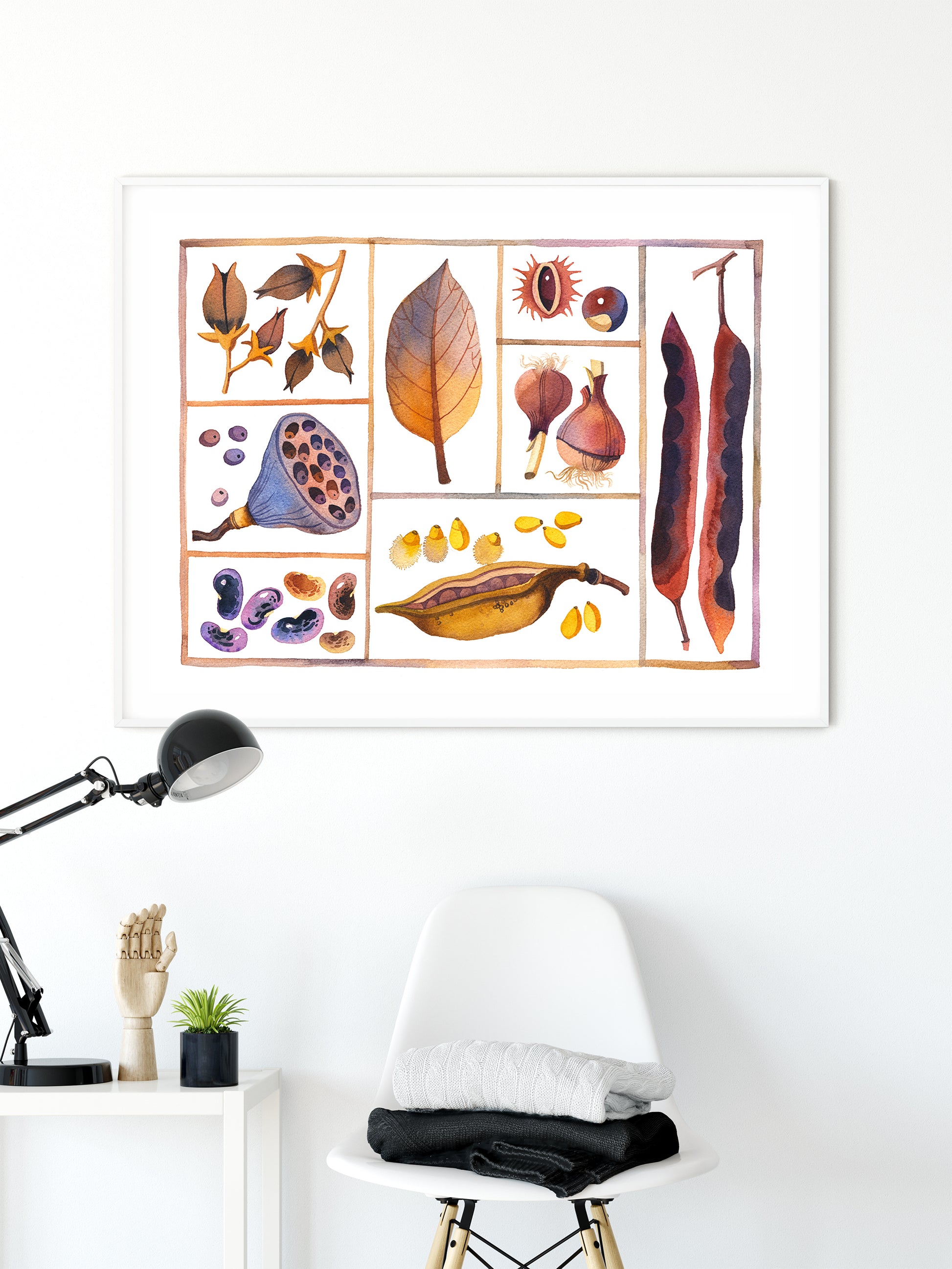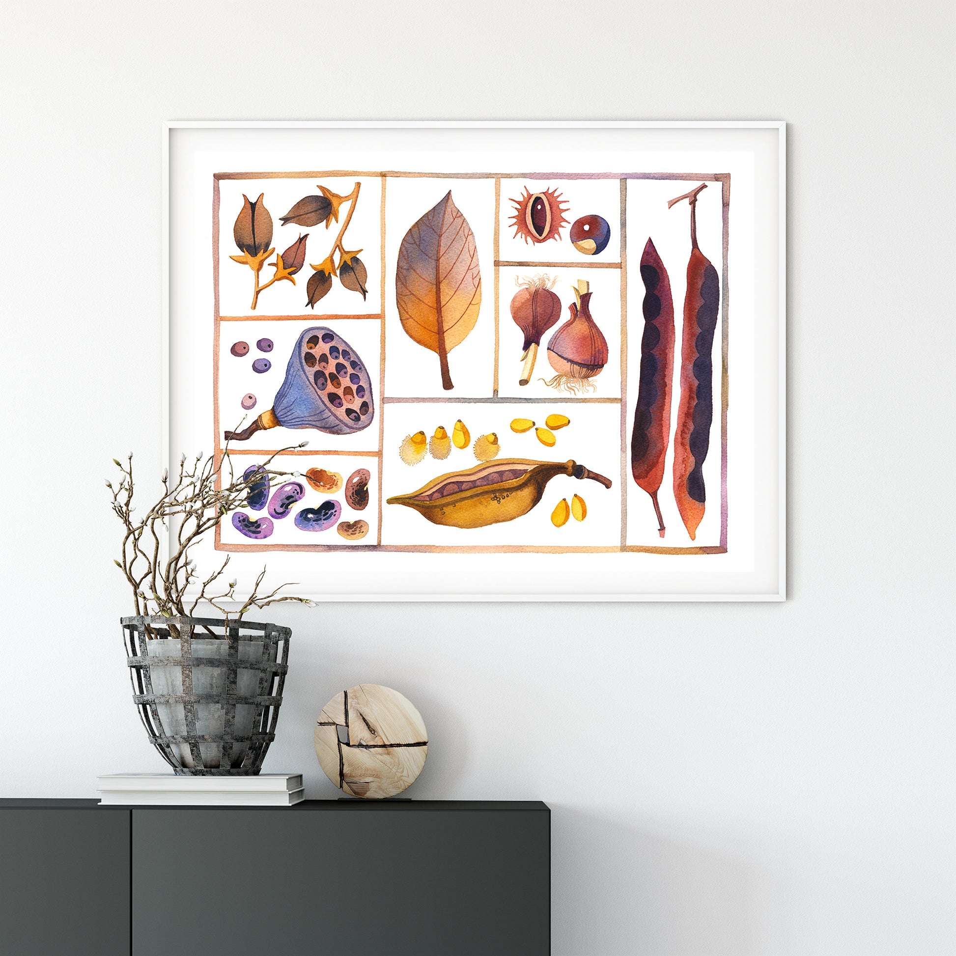 Fine art print NATURE GIFTS COLLECTION #01 from my NATURE GIFTS series. The artwork represents Foxglove tree fruit, Lotus with seeds, Beans, Magnolia leaf, Chestnuts, Tulip bulbs, Brachychiton pod with seeds, Honey Locust pods. Originally made from life in watercolor technique finished with ink and later turned into giclée—fine art prints of museum quality.