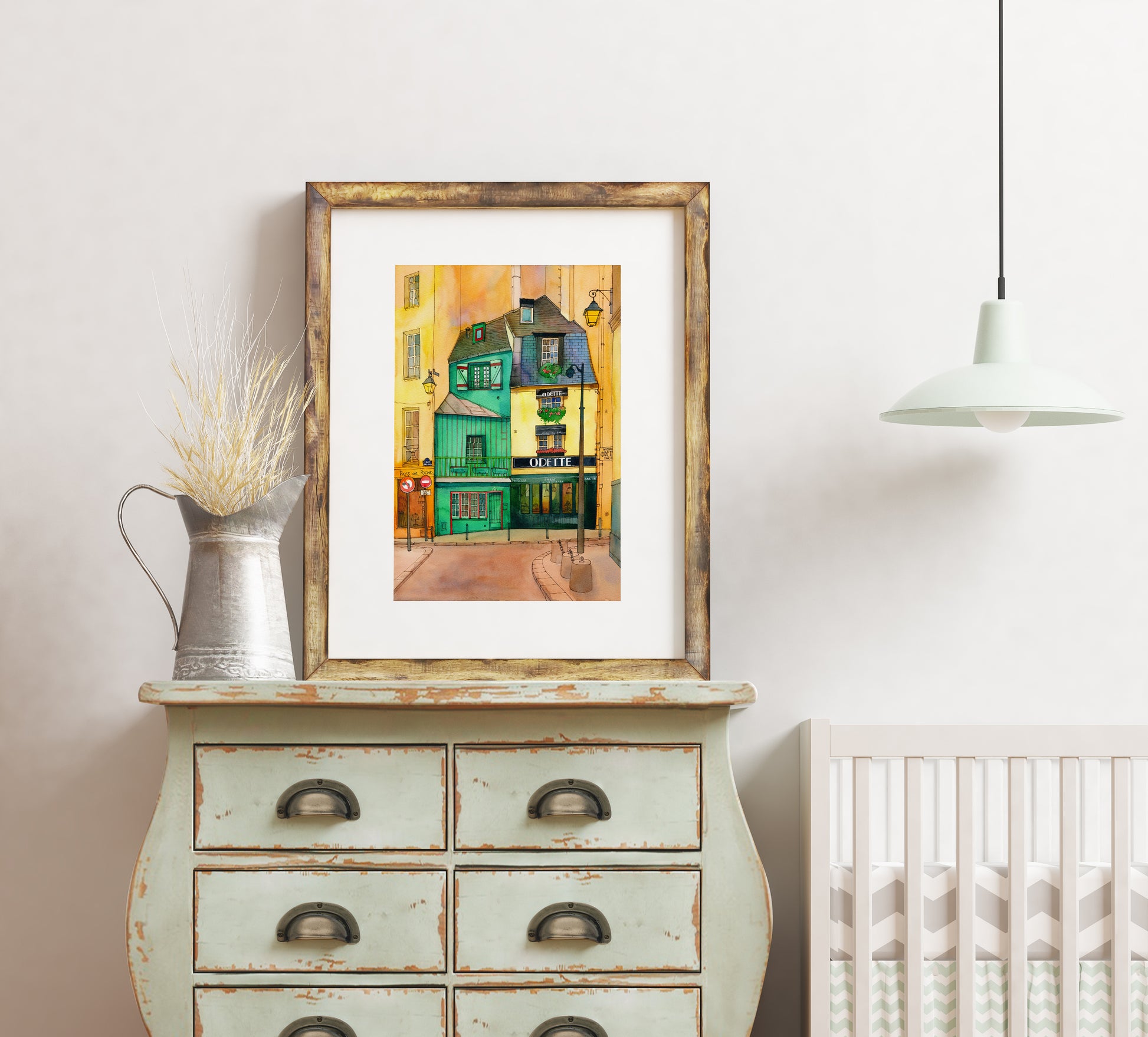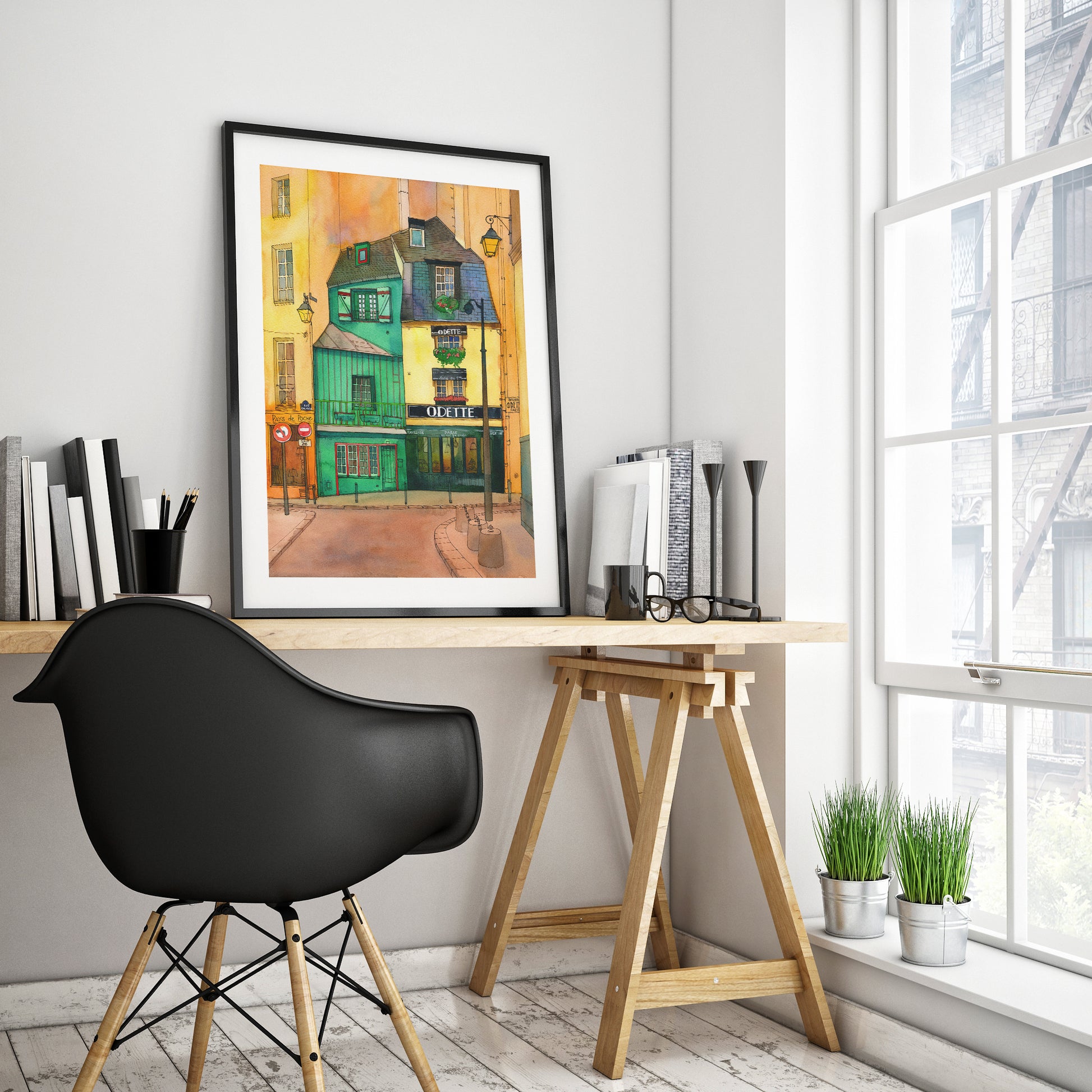 Fine art print ODETTE CAFE IN PARIS. Originally made in watercolor technique and later turned into giclée—fine art prints of museum quality.