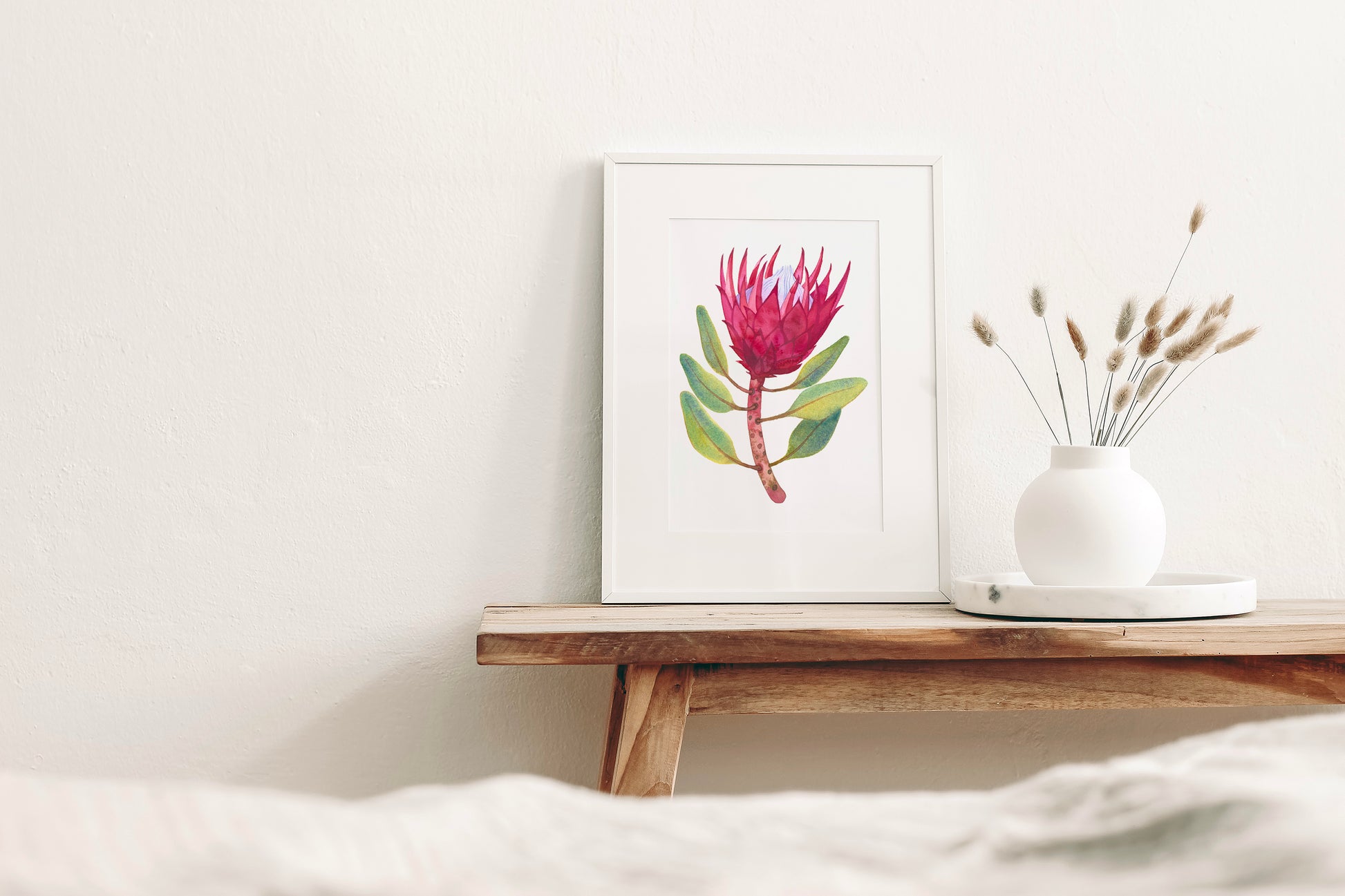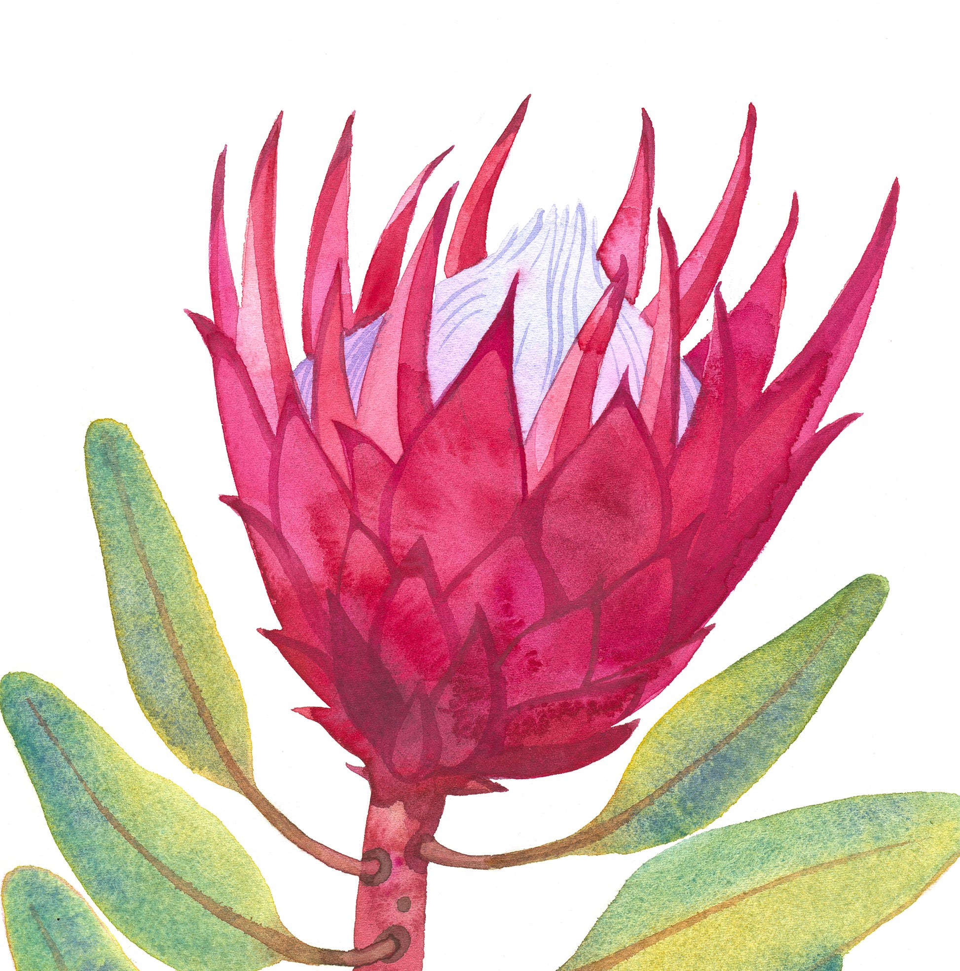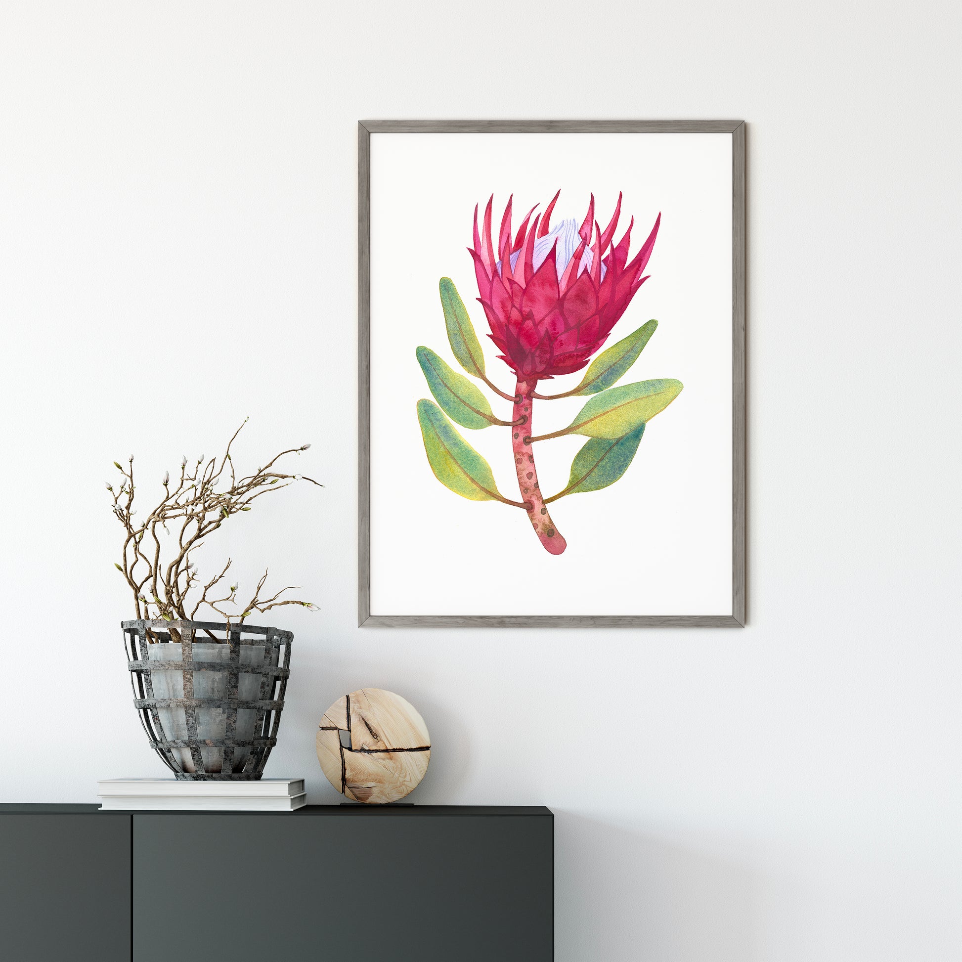 Art print of PINK KING PROTEA, originally made from life in watercolor technique and later turned into giclée—fine art prints of museum quality, printed with Canon technology which ensures reduction of granularity, smooth color gradation and high print resolution. Prints made using this technology can last for more than 200 years in a photo album, for about 40 years on display behind glass, and for about 10 years without glass.