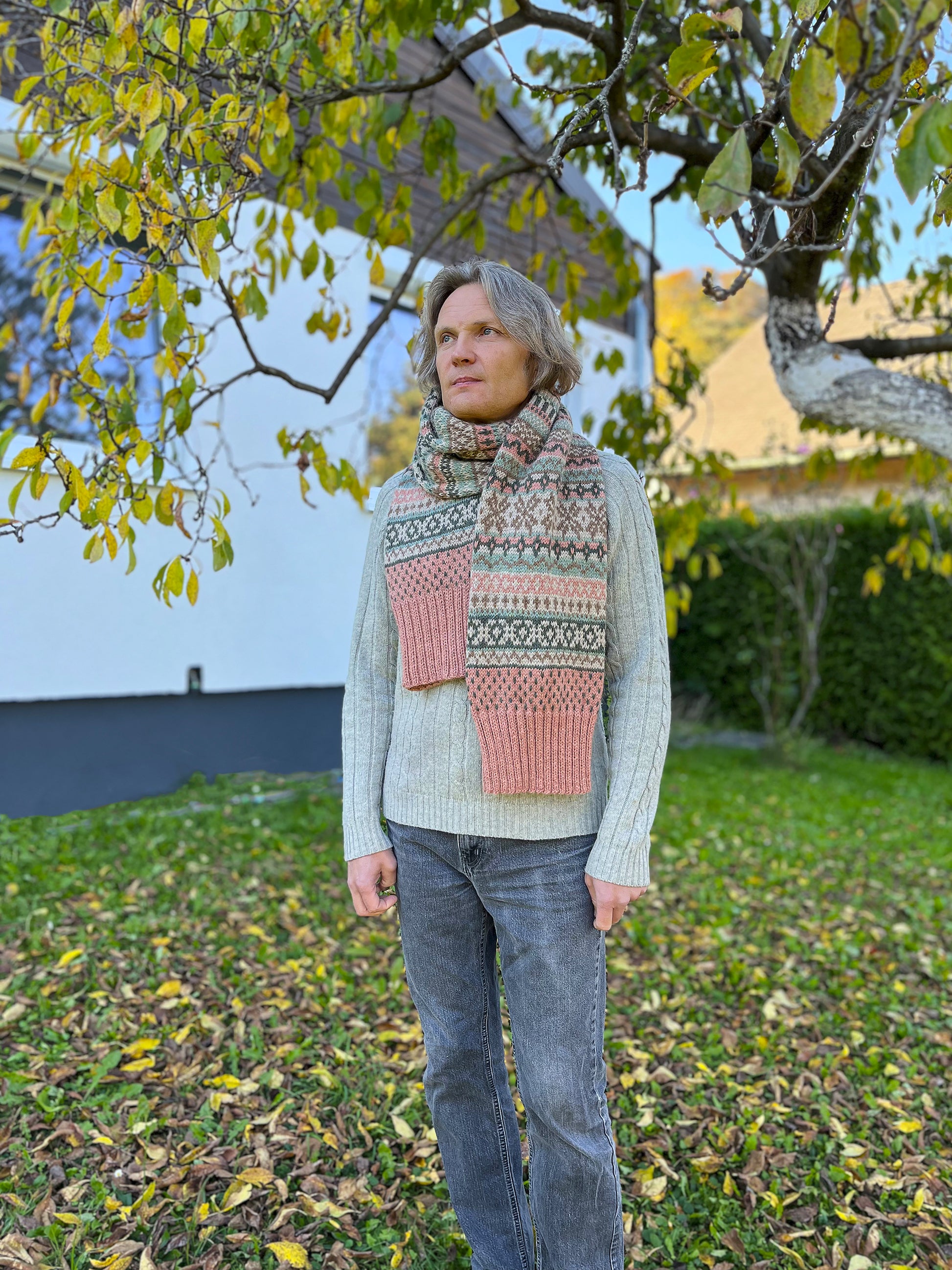 Introducing the ROHUKÜLA design, an extra-long scarf inspired by traditional Fair Isle patterns. Crafted with the finest quality yarn, this scarf offers exceptional softness and warmth. The circular knitting technique ensures a seamless, double-layered construction.