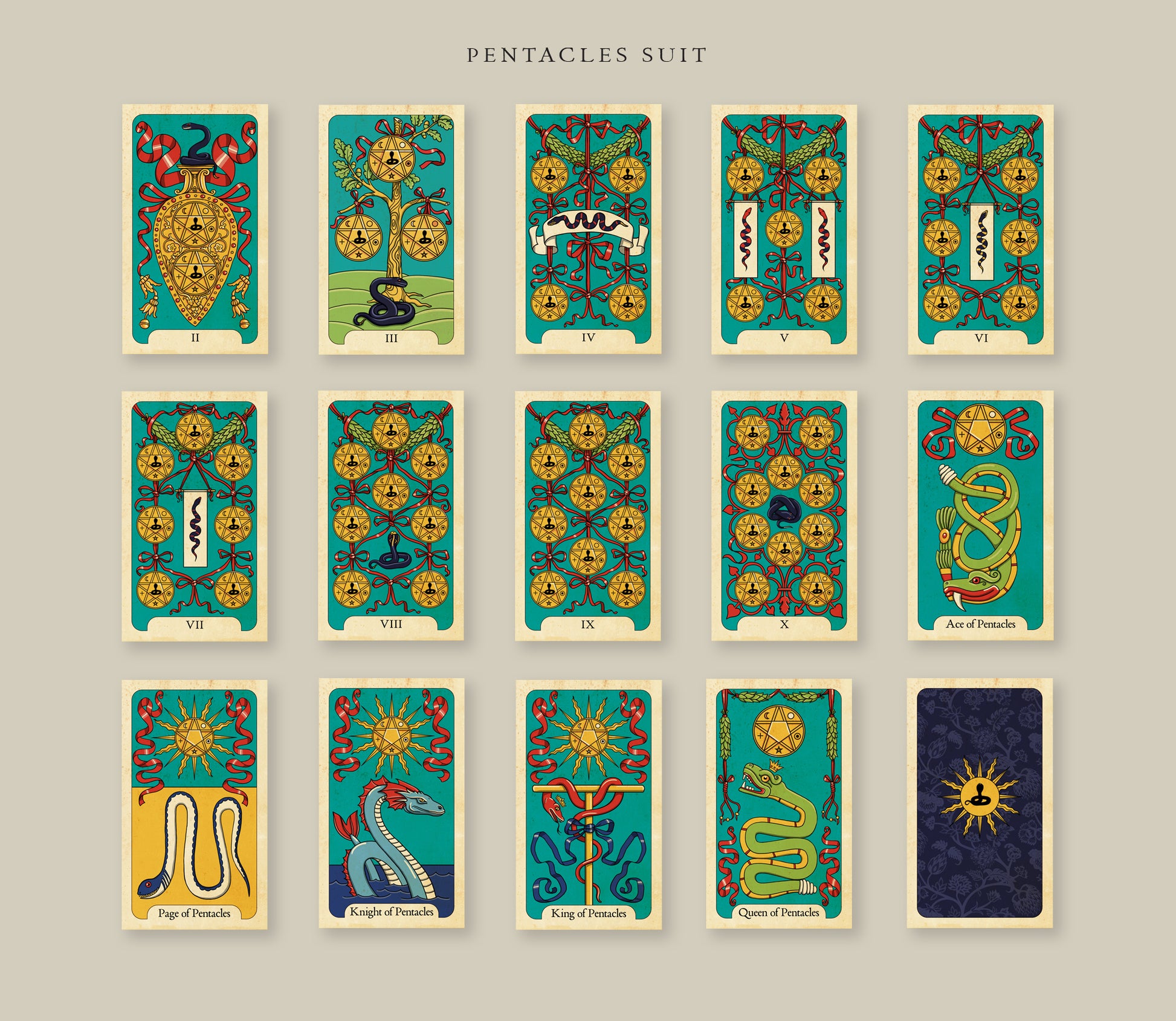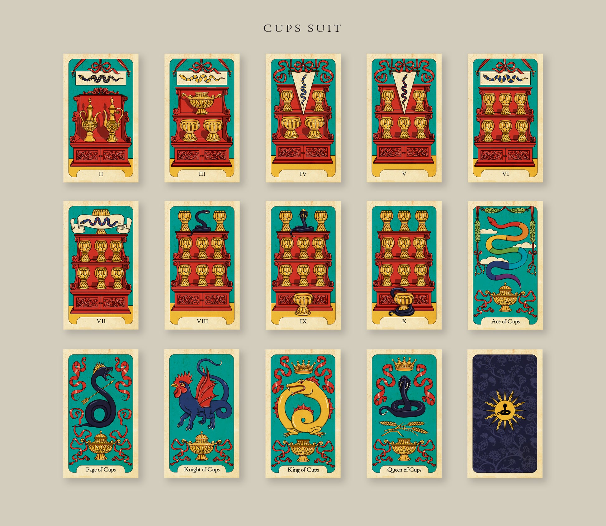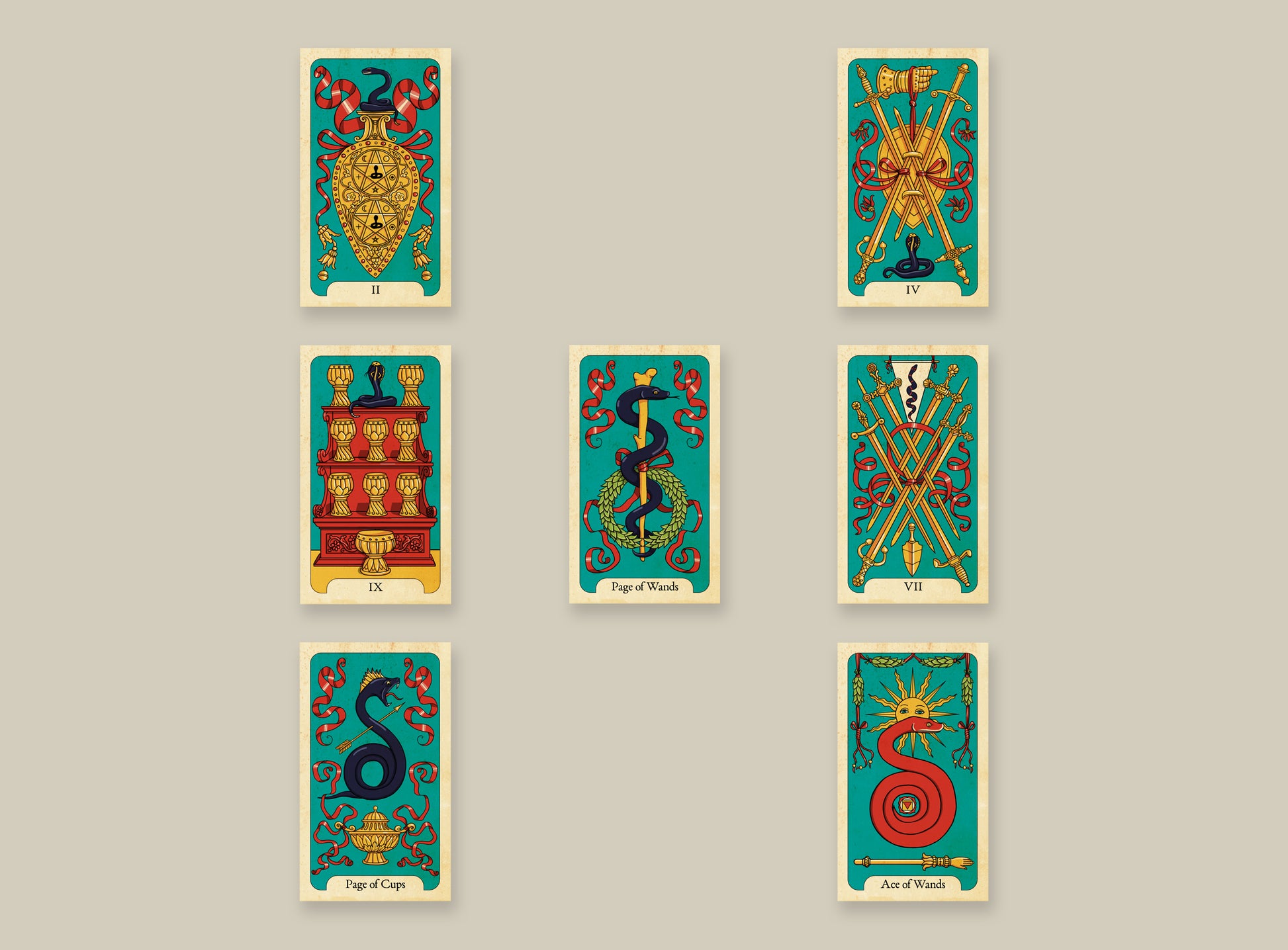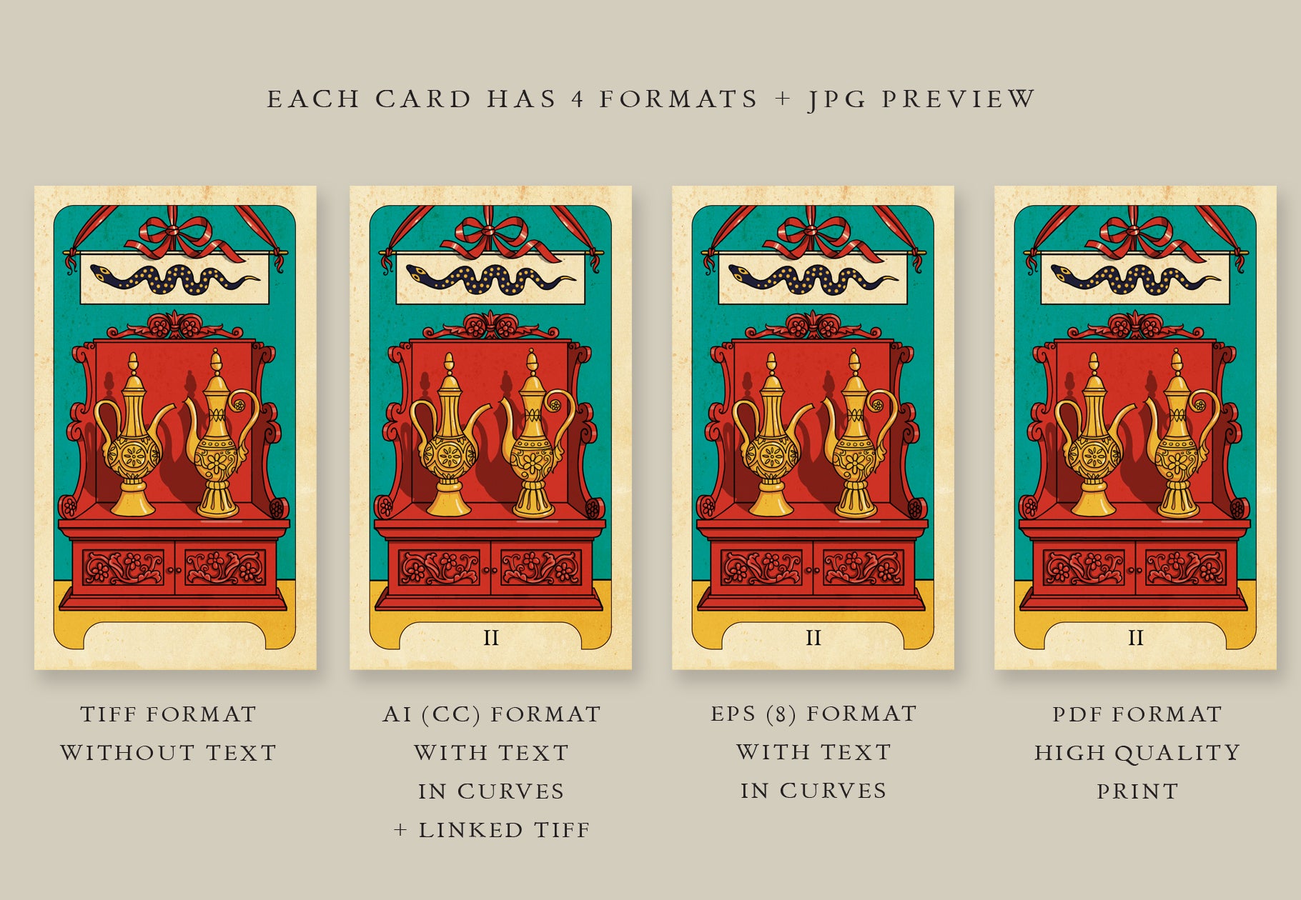 SNAKE TAROT DECK contains 56 ready-to-print Minor Arcana cards, one card back side and card box layout. Each card is 80×130 mm (including 5 mm bleeds) has TIFF format, AI with link to TIFF-image, EPS, PDF (with high quality print settings) and high quality JPG. The card design inspired by old Tarot decks and performs all legendary snakes like Ouroboros, Apep, Basilisk, Python, Wadjet and others.
