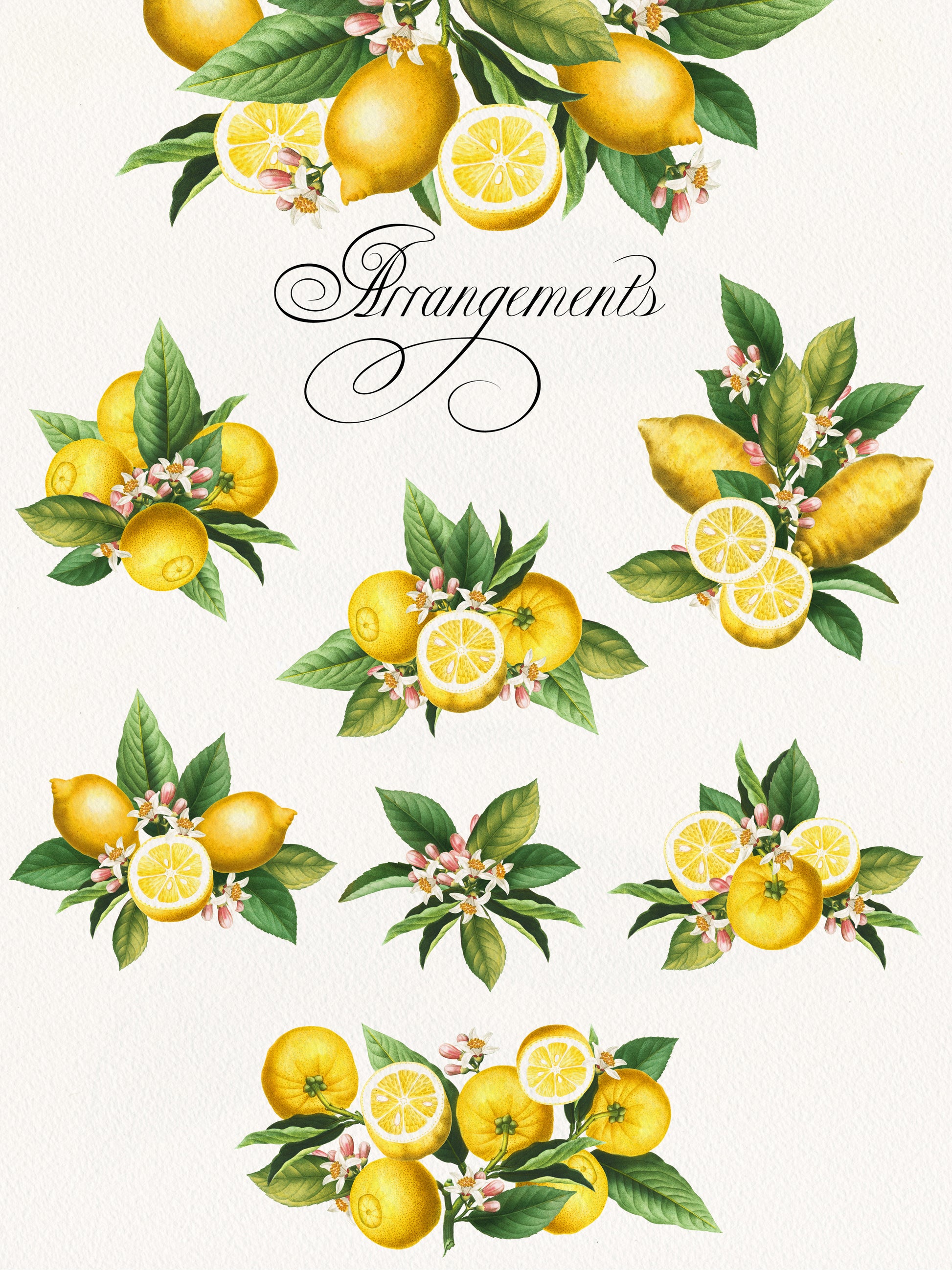 VINTAGE LEMON CITRUS graphic collection clipart contains citrus images and arrangements from antique botanical plates. These illustrations are in the public domain. The original images have been slightly edited, colors were made brighter.