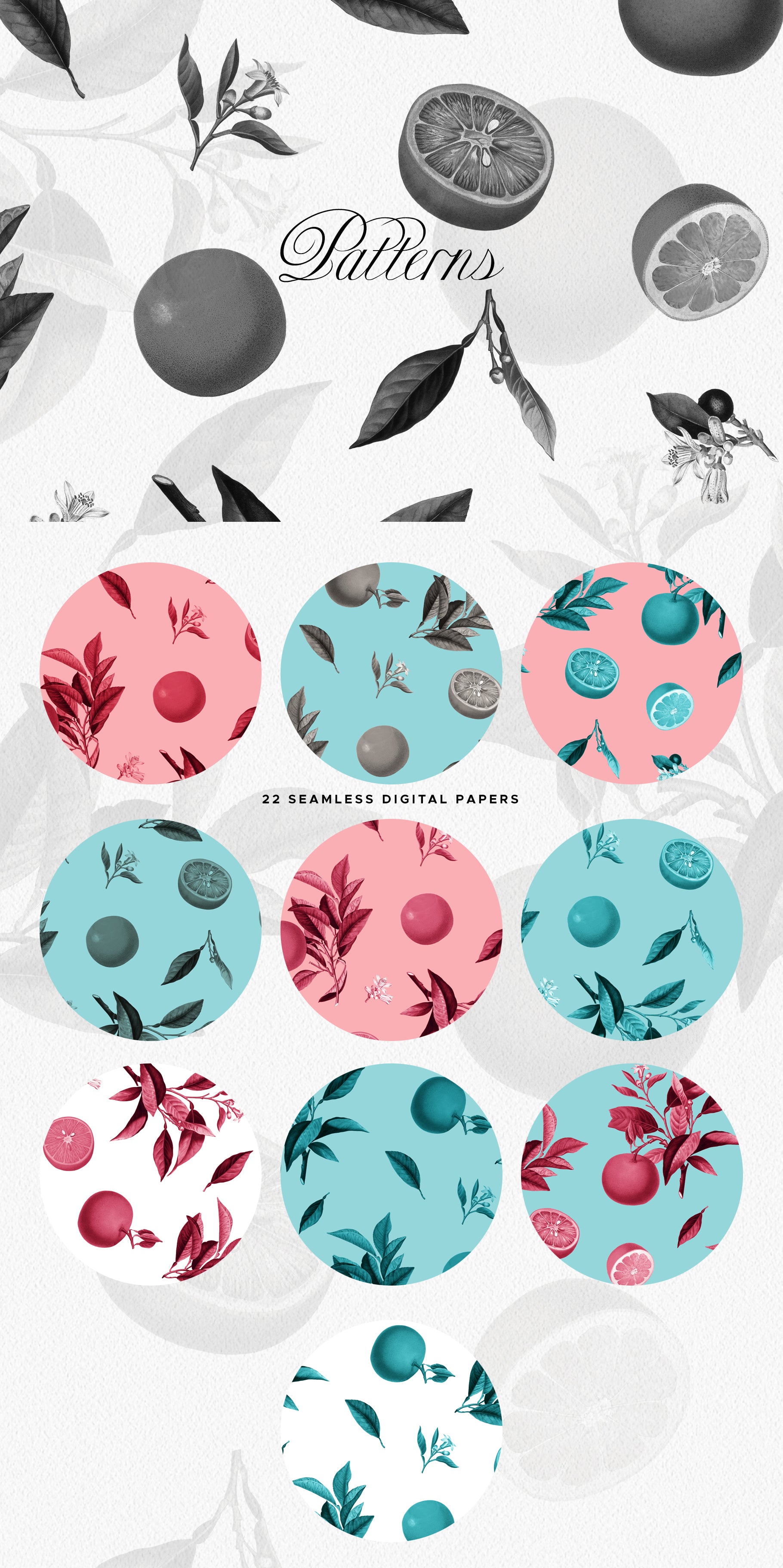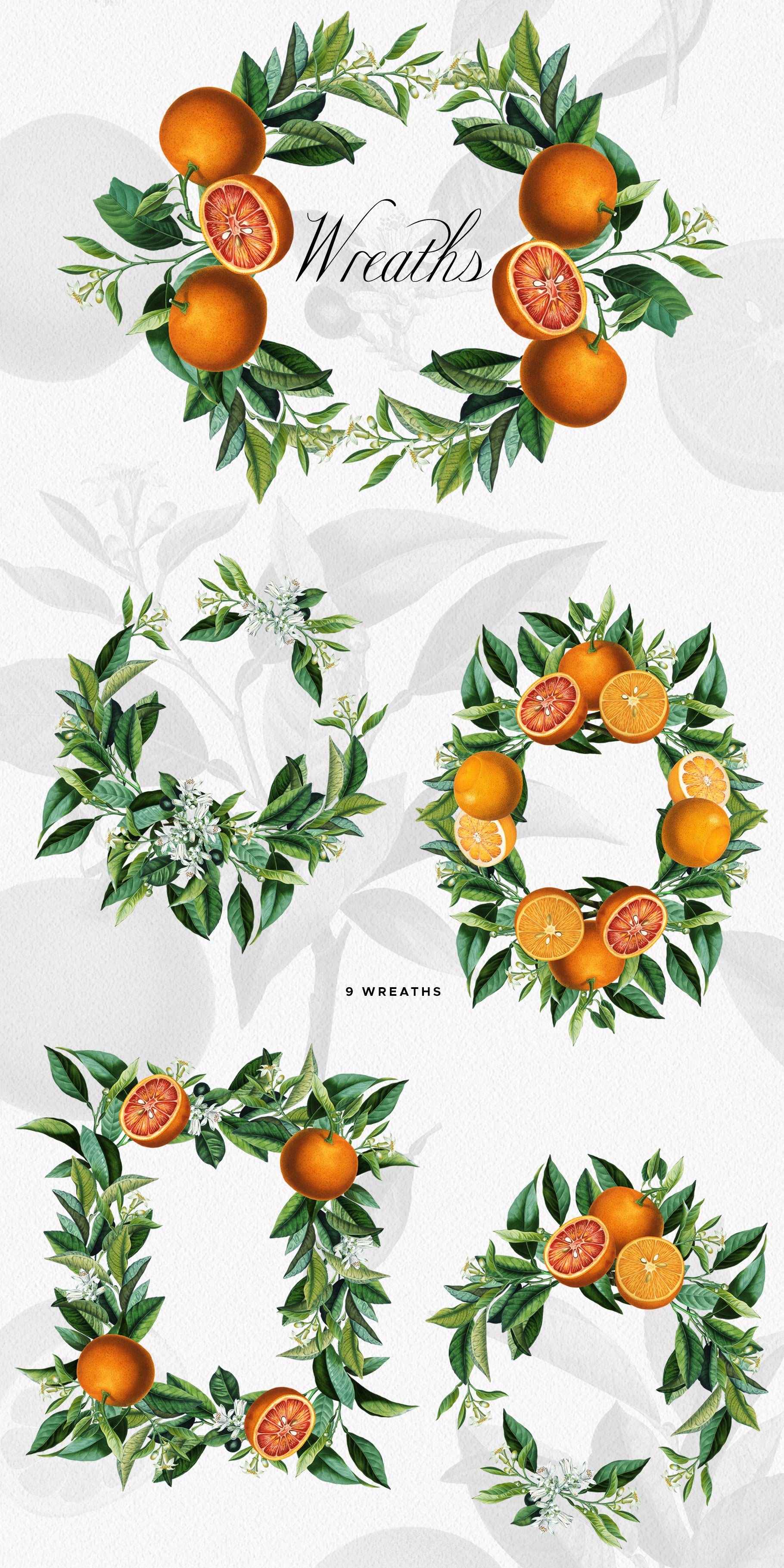 VINTAGE ORANGE CITRUS graphic collection contains citrus images and arrangements from botanical plates «Pomologie Française» (1846) by Pierre-Antoine Poiteau. These illustrations are in the public domain. The original images have been slightly edited, colors were made brighter.